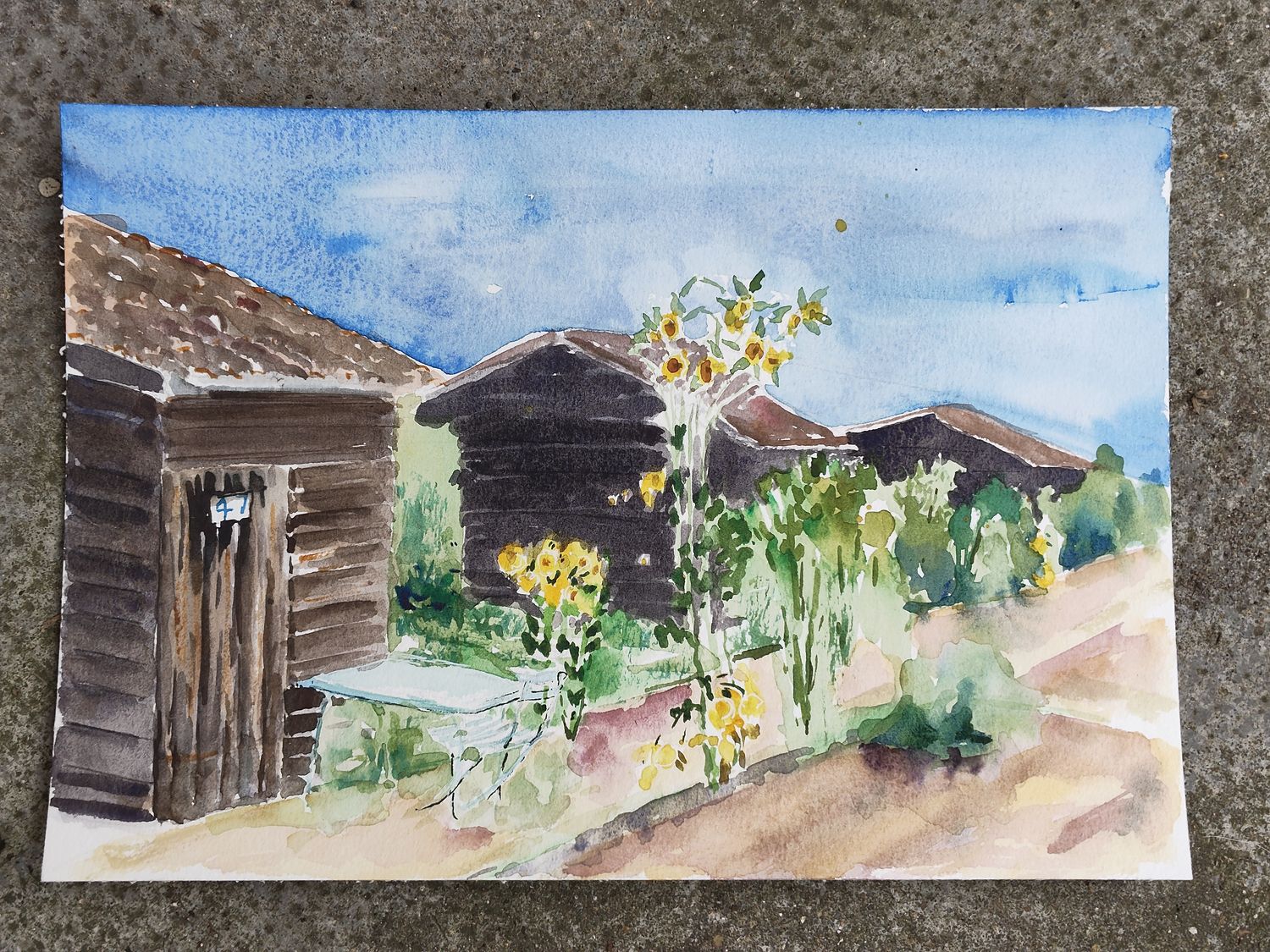 C'est plutôt le ciel qu'il faudrait alléger, à mon sens, par exemple en l'eclaircissant à la limite du toit du premier cabanon. Je ne sais pas quel papier tu as utilisé mais il donne au ciel une texture étonnante surtout dans la partie gauche. Les traces très marquées à droite enlèvent aussi son côté naturel.