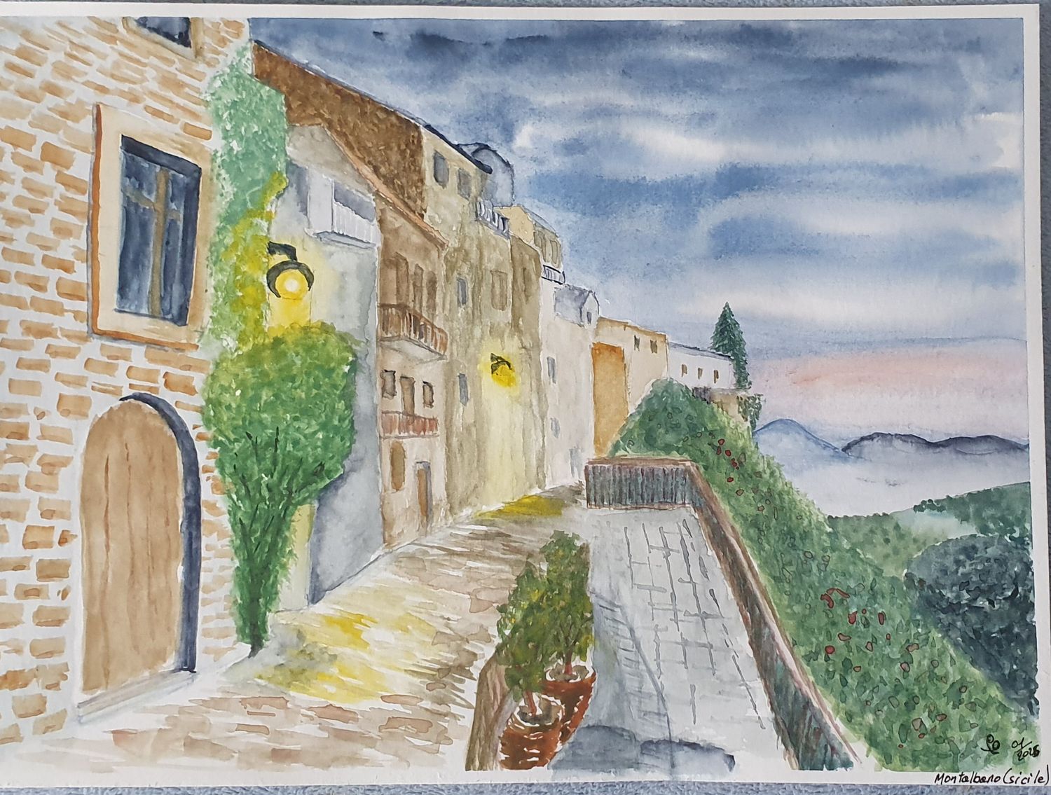 J'ai toujours l'idée de contribuer au post de Simouhé sur l'inspiration mais le sujet est compliqué pour moi. Ça viendra mais là j'ai un cas concret. En triant mes photos récentes d'un voyage en Sicile je suis tombé sur celle du village de Montalbano en début de nuit. Superbe village médiéval. Là j'ai eu une vraie inspiration pour représenter une ambiance nocturne mais pas trop.