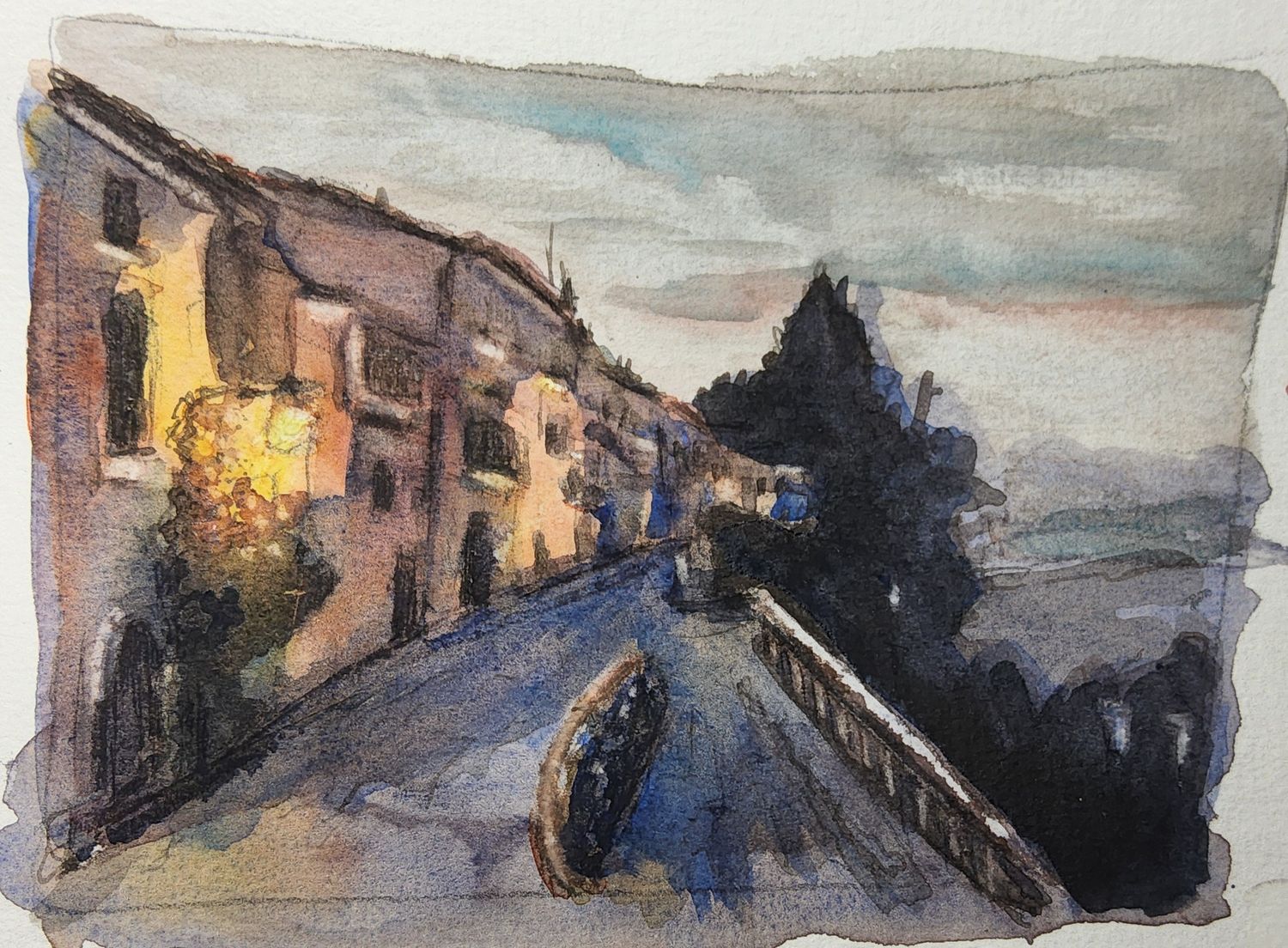 Pour le crépuscule tu y es. Pour la nuit, réfléchi à refaire, sur une feuille neuve, seulement le ciel et la partie centrale avec de l'Indigo et Noir de bougie en mélange (les batônnets de la rétine). On oublie les façades éclairées par les lumières. Tu vas faire émerger la "nuit noire" et ce n'est pas simple du tout comme exigence !!! car il ne te reste plus beaucoup de couleurs pour t'exprimer, et tu dois mettre en veilleuse ton talent pour faire émerger le réel avec les trois fois rien qui restent.