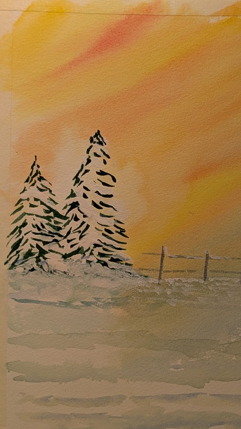 D'après cartes de Noël d'il y a deux ans d'après le post sans fluide de masquage les sapins avec la neige en réservant le fond encore humide le tuto m'a permis d'apprécier la marge d'amélioration !