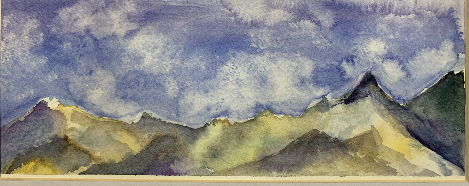 Mes montagnes manquent de relief à droite et je n'ai pas osé retoucher trop le ciel à cause du papier, mais j'ai pris beaucoup de plaisir à peindre et je me suis sentie très libre et un peu plus à l'aise pour peindre dans l'humide.
