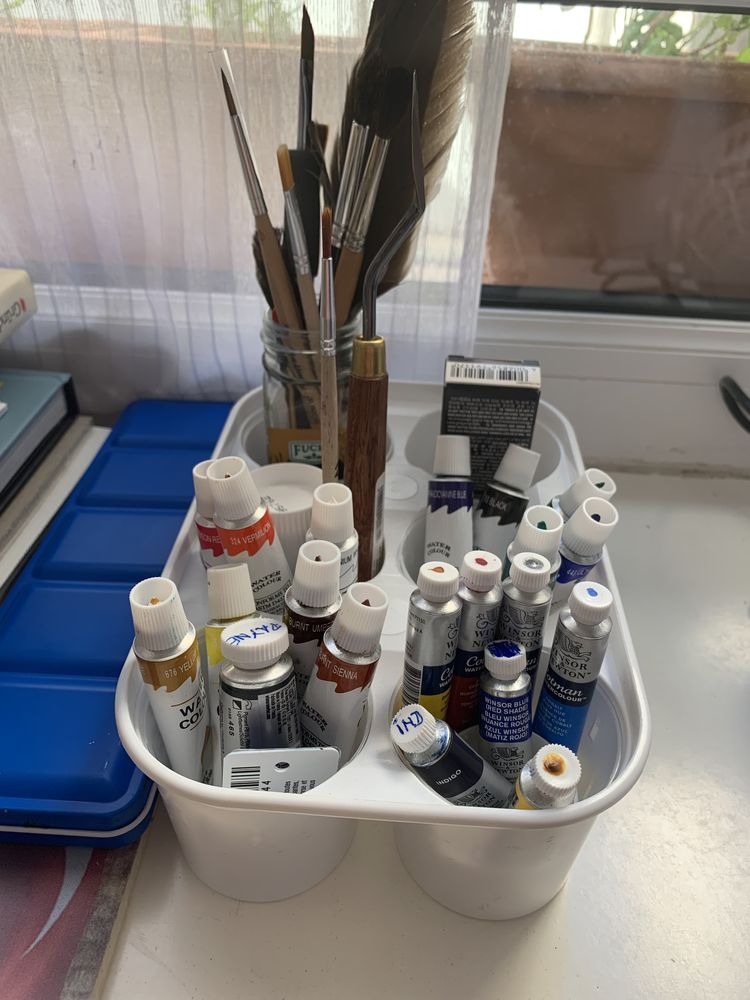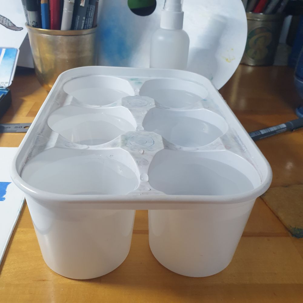 Trouvé sur internet (je ne sais plus auprès de quel yutubeur.se artiste peintre), le bac à faisselles, 6 pots d'eau en un, j'adore !!! Je suis fainéante ça me permet de me concentrer plus longtemps sur mon sujet sans changer d'eau ...