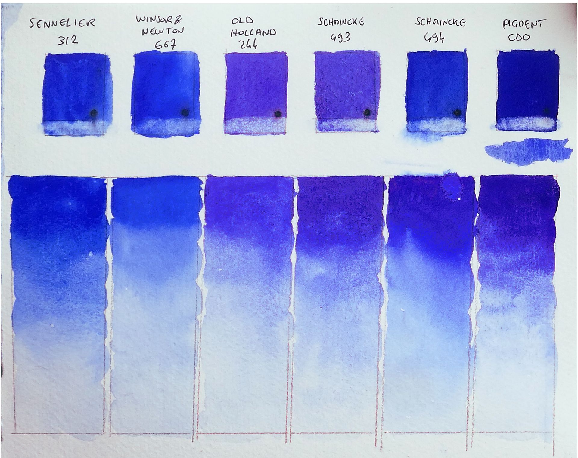 Le Old Holland et le Schmincke 493 tirent nettement vers le violet. Le Winsor & Newton est celui qui contient le plus de turquoise (bleu ciel similaire à un bleu de phtalo nuance rouge).