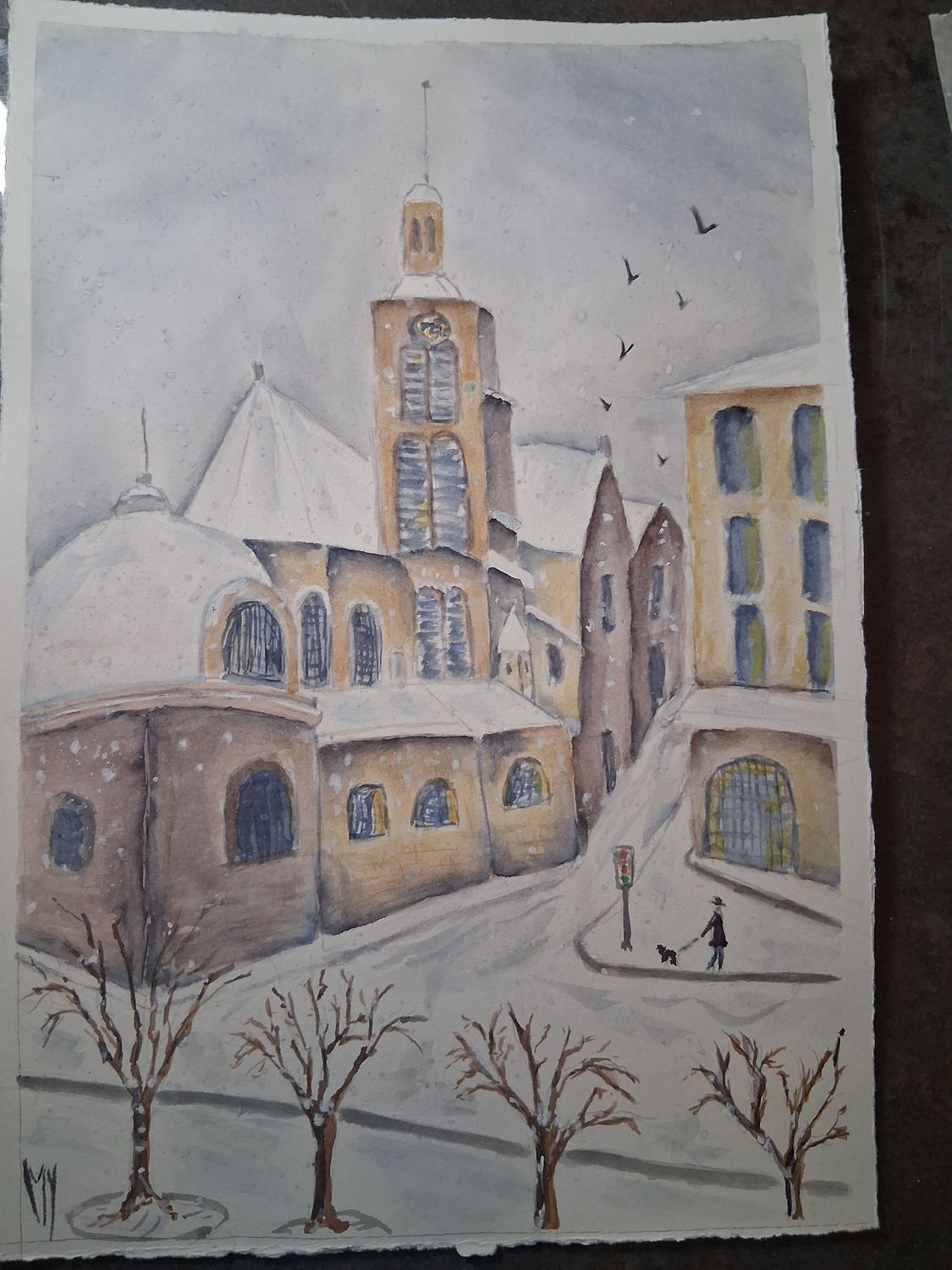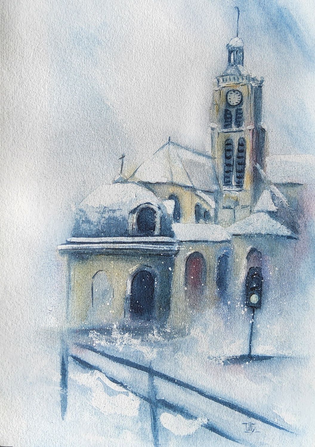 Bonjour, voici mon interprétation de cette église parisienne. Je travaille sur le papier cellulose Clairefontaine Étival que je trouve extraordinaire pour du cellulose. Je dois avouer que je ne trouvais pas trop l'inspiration et l'aquarelle est un peu sage, en contradiction avec mon style habituel. Je ne fais de l'aquarelle que depuis début janvier.