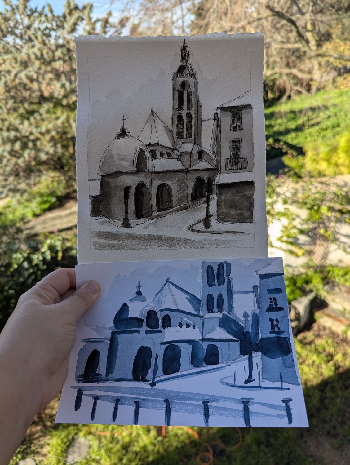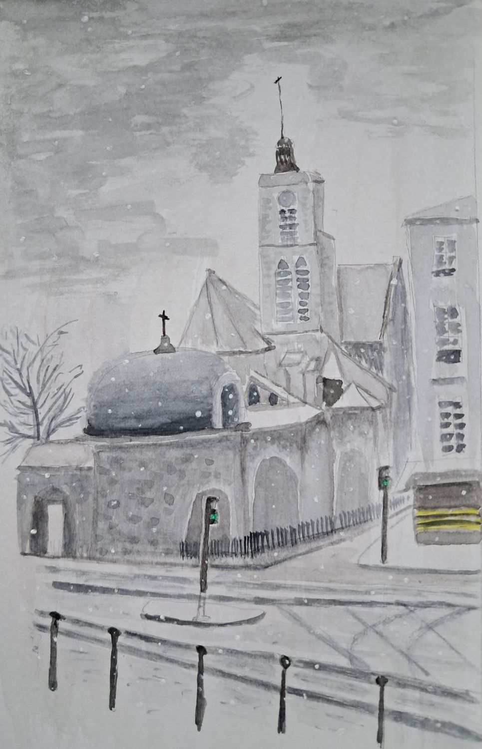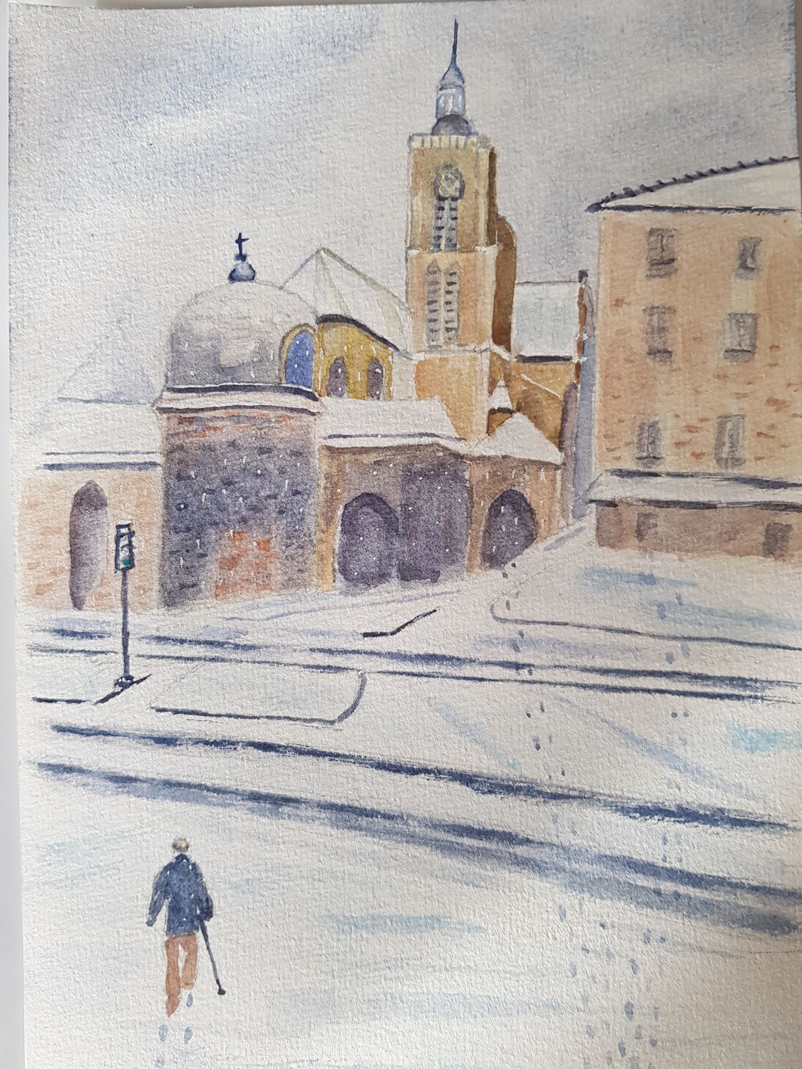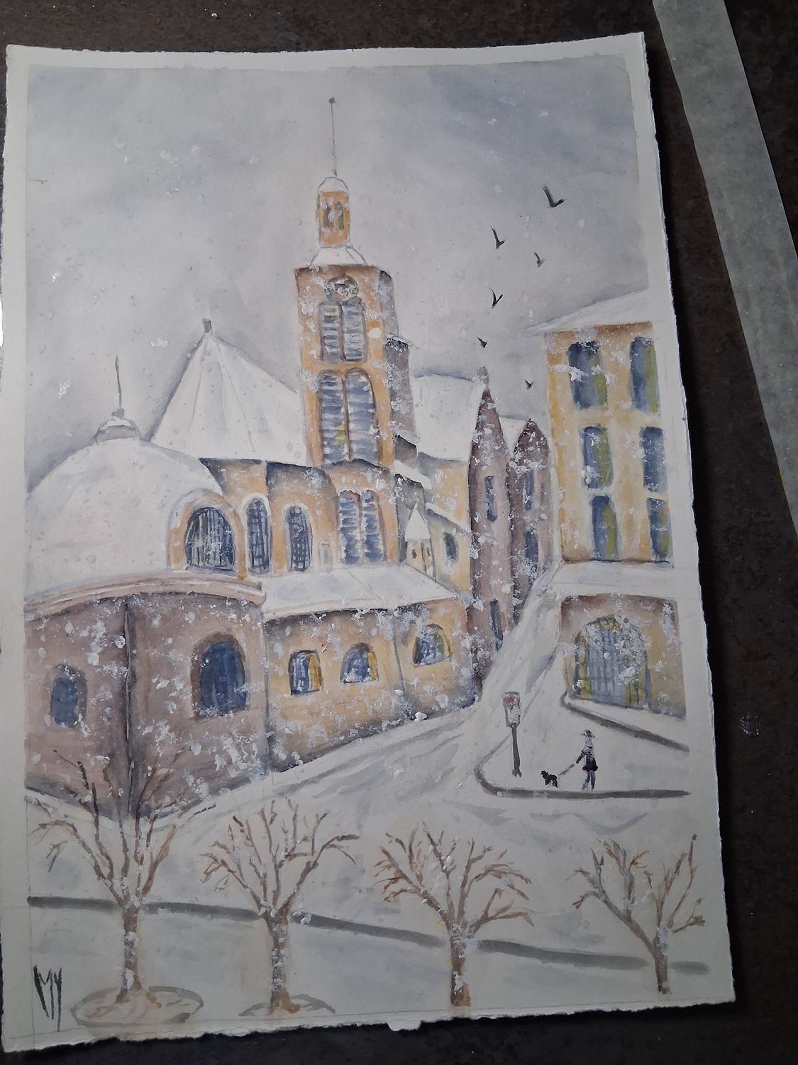 Bonjour à tous, comme je n’étais pas satisfaite de mon aquarelle, trop de détails, plus j’ai ajouté des arbres qui n’avaient rien à faire là, ect. Je les ai donc estompé et pour rendre cette ambiance de neige, j’ai flouté le tout en ajoutant la neige à l’éponge. Il me semble que c’est mieux. J’attends vos avis avec impatience. Aurélie ton aquarelle est bien, et efficace, bonne ambiance.
