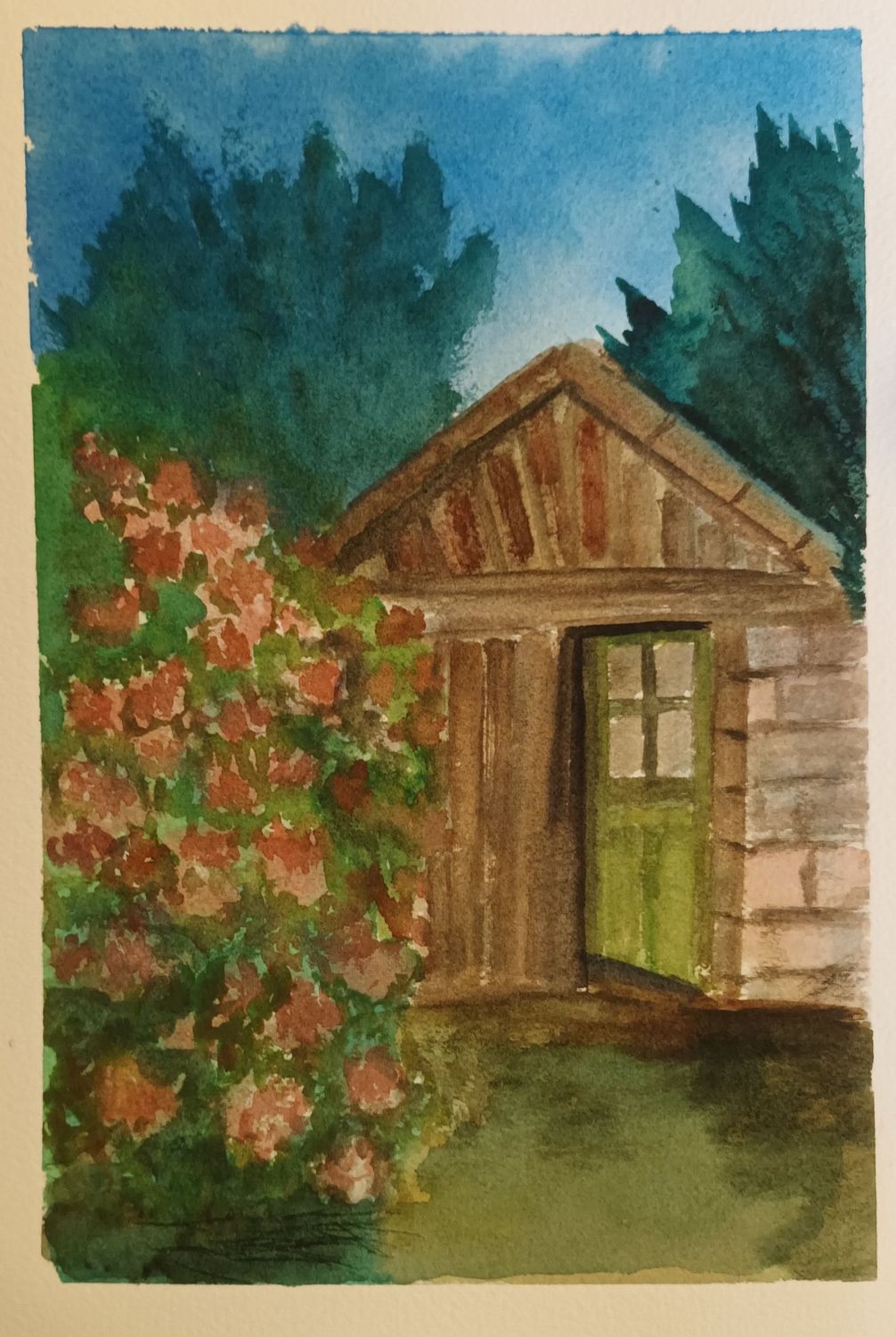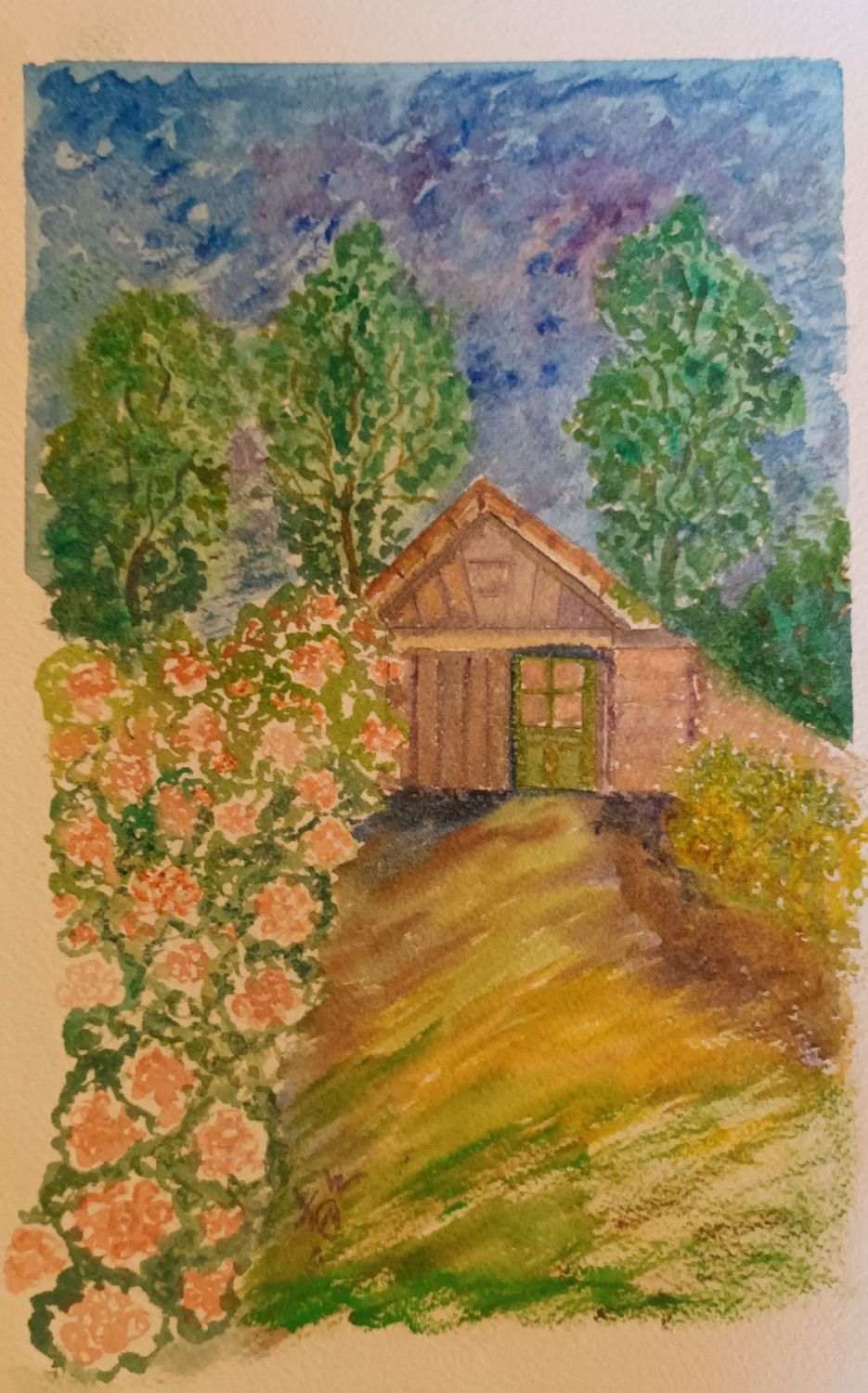 Enfin dernier essai . J'ai commencé par le ciel et mon papier s'est mis à gondoler( je n'avais pas mouillé le coté dessin et j'ai mouillé au pinceau pour faire le ciel. ) , du coup je n'ai pas mouillé le reste et travaillé uniquement dans le sec, en laissant pas mal de blanc . Quant au ciel j'ai essayé de réparer une tache verte malencontreuse avec du violet et j'aime bien le résultat.