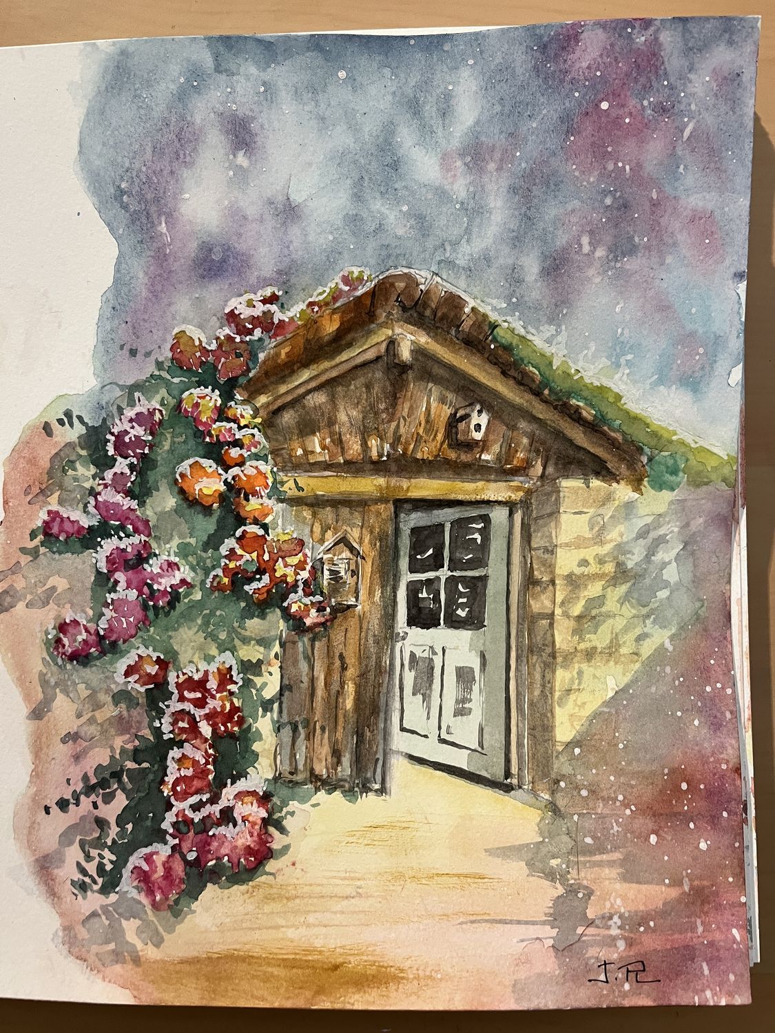 Une première interprétation avec des montagnes pour donner un peu de profondeur. Comme je trouvais qu'il manquait de la lumière, je me suis lancée à faire une deuxième. 😊