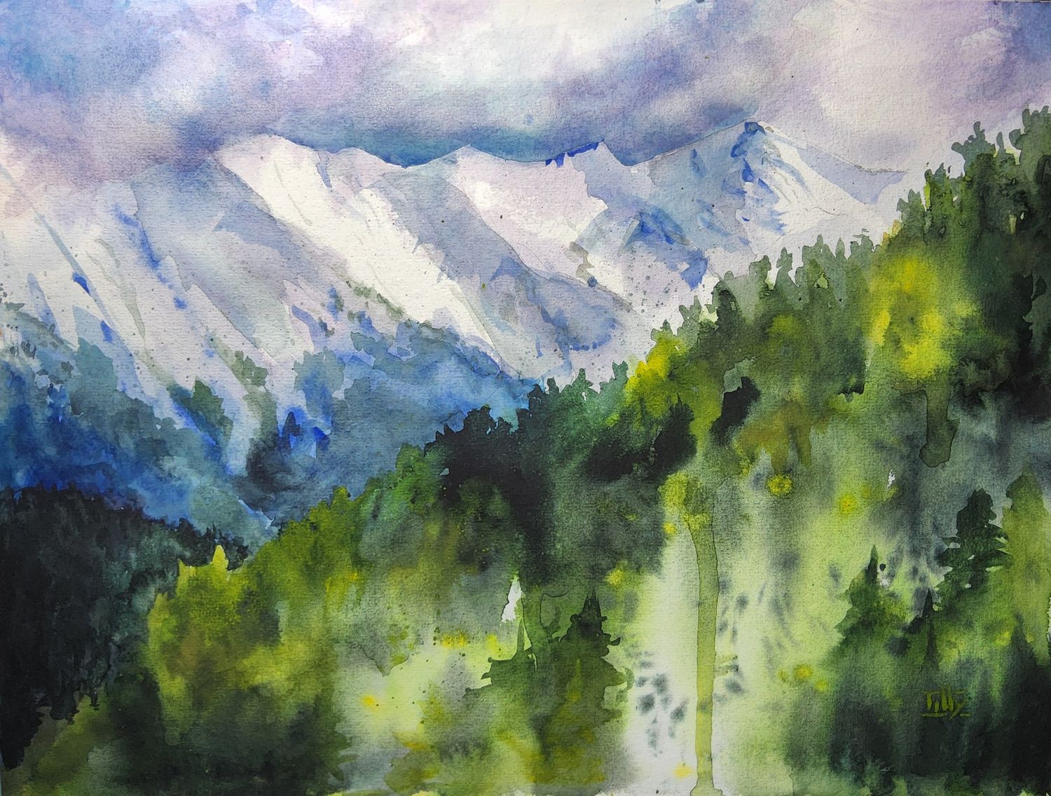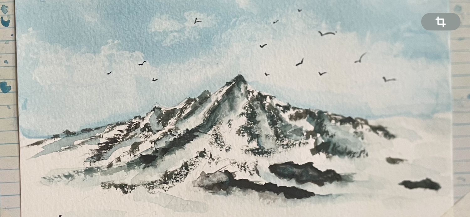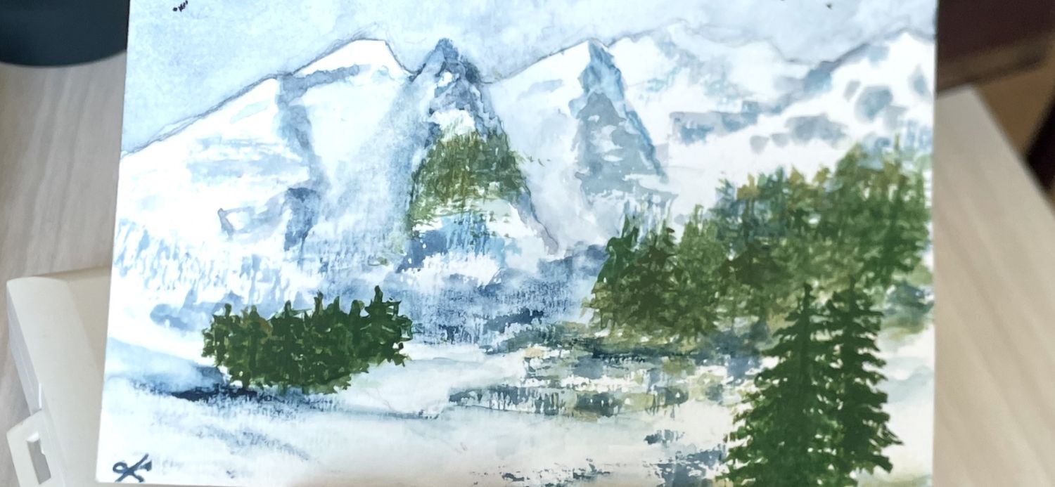 Je sais que ce n'est clairement plus Noël, mais j'avais envie de tester ce paysage. Mon tout premier en aquarelle. Que de défis chez les Vagabonds !😅