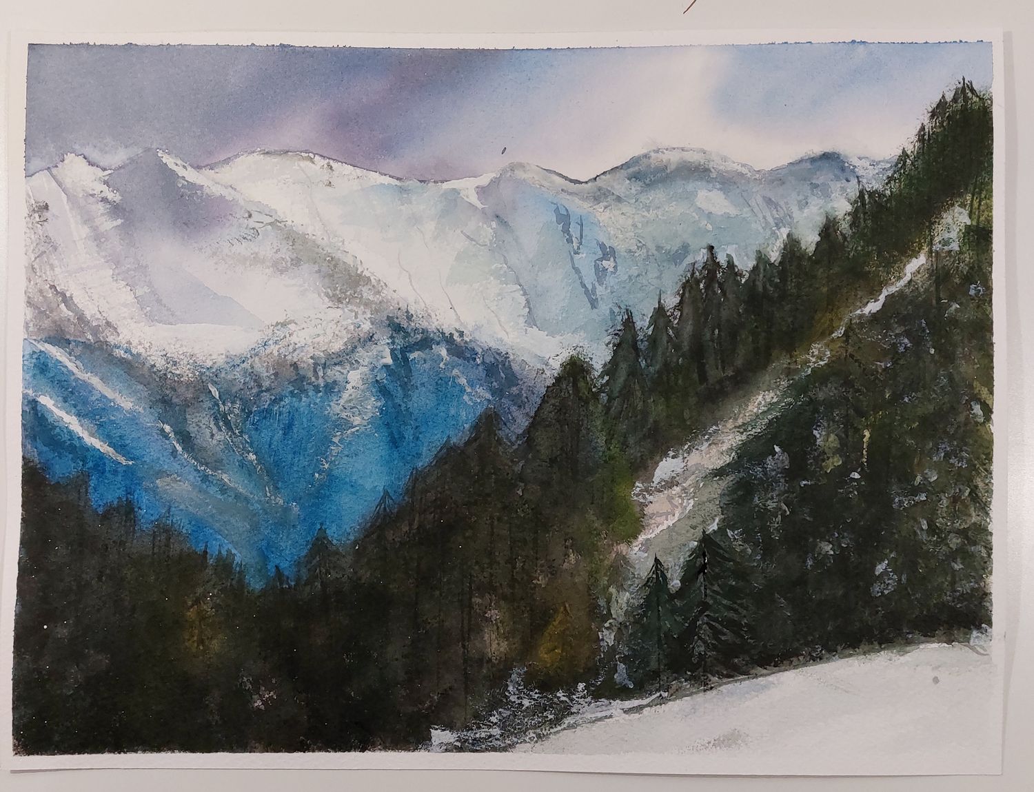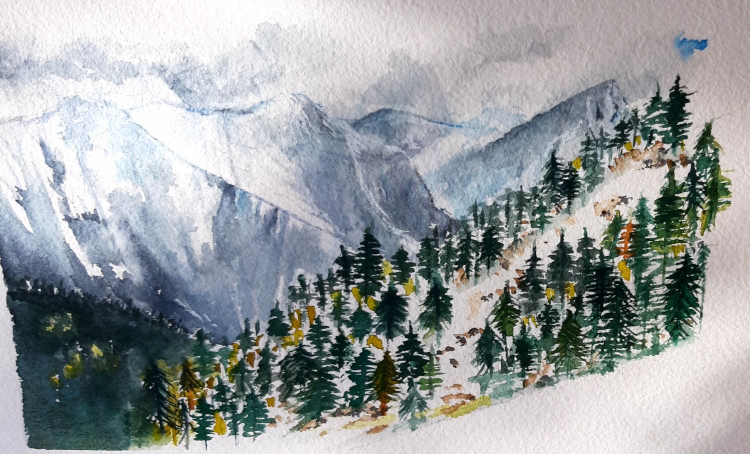 Franchement ton premier essai est beau, les montagnes ressortent super bien. La forêt au premier-plan est un peu trop sur-travaillée. L'harmonie des couleurs est très belle. J'aime beaucoup !