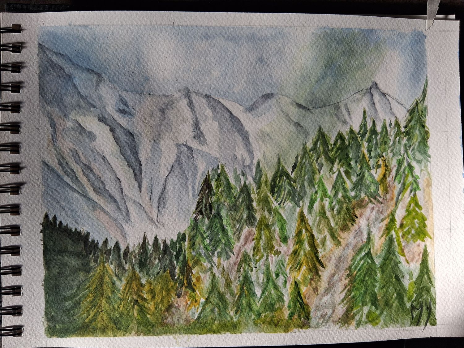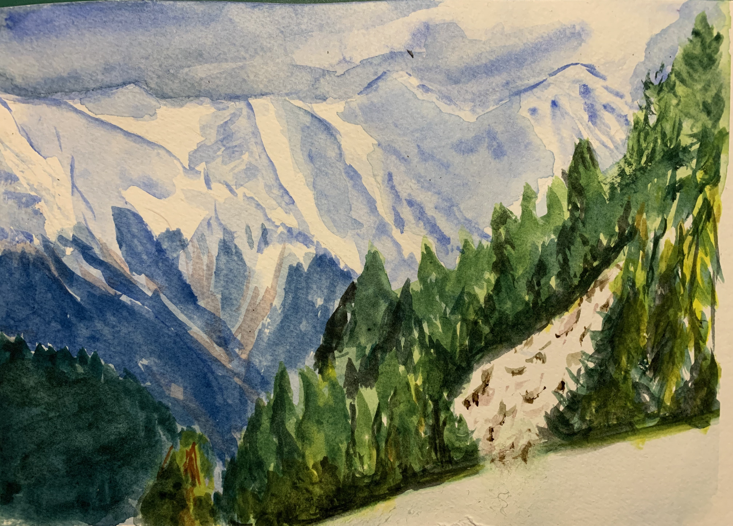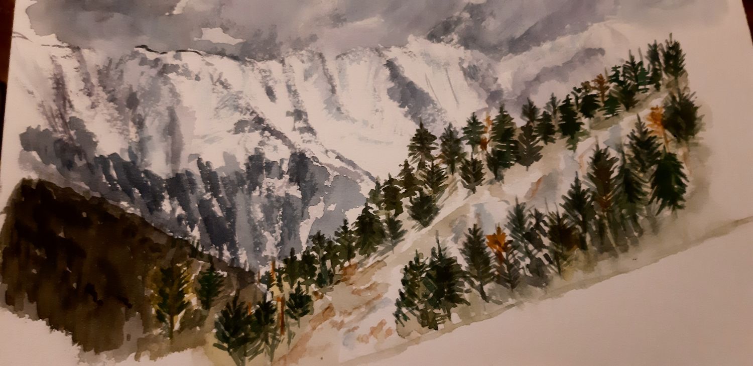 Pas facile la forêt à faire. Au plus je voulais mettre un peu "d’ordre" au plus c’était la pagaille. Les montagnes, moyen, et j’ai voulu fzire la brume qui descend des montagnes et là un mélange de couleur jaune était sur ma palette.....et c’est retrouver sur mon aquarelle. J’ai grand besoin de conseil... erci à tous et toutes