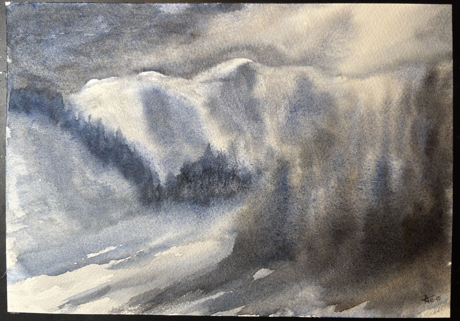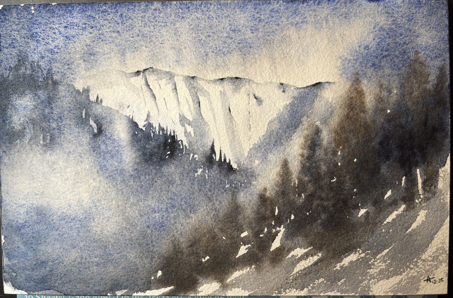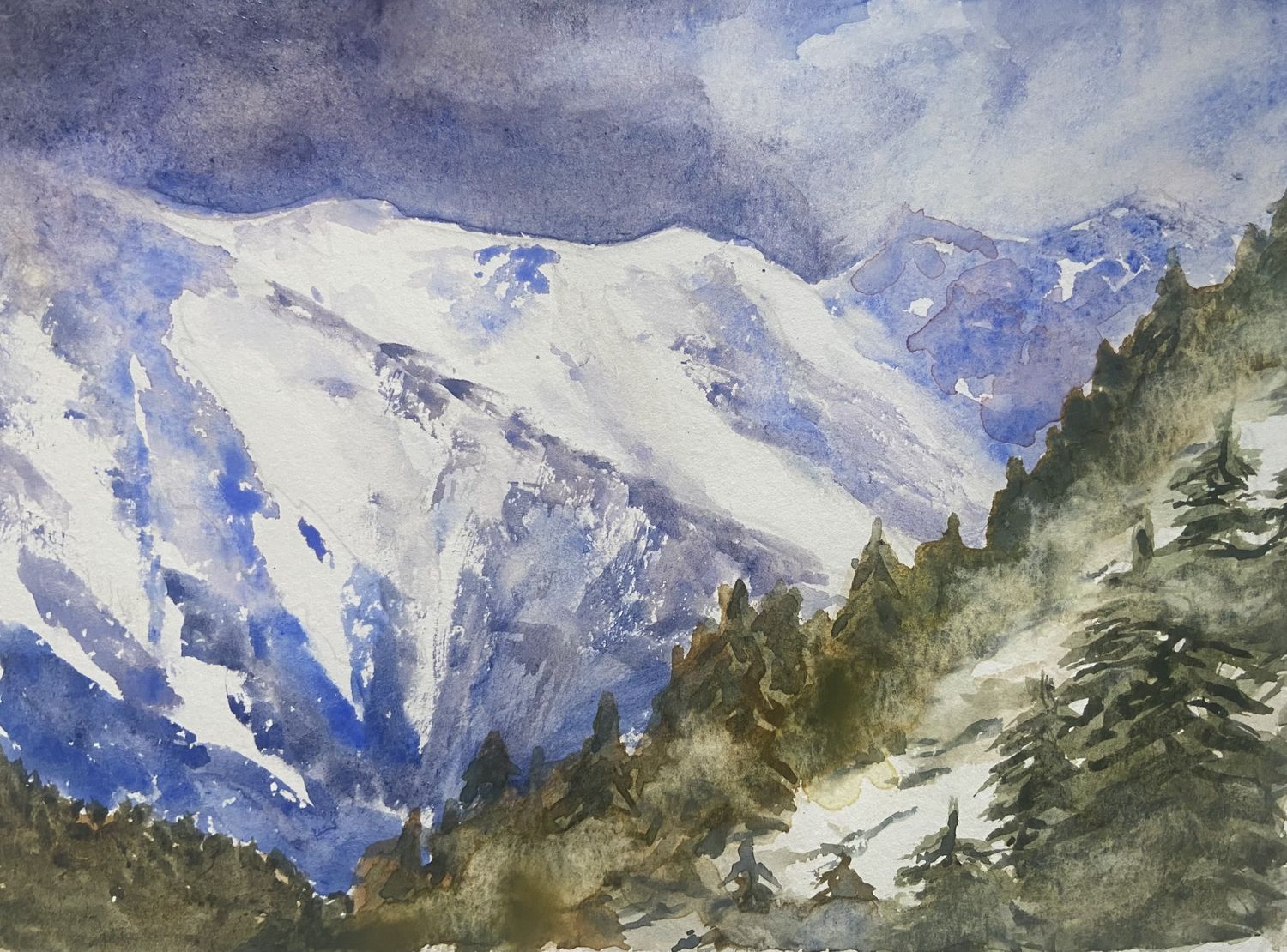 Pas facile la forêt à faire. Au plus je voulais mettre un peu "d’ordre" au plus c’était la pagaille. Les montagnes, moyen, et j’ai voulu fzire la brume qui descend des montagnes et là un mélange de couleur jaune était sur ma palette.....et c’est retrouver sur mon aquarelle. J’ai grand besoin de conseil... erci à tous et toutes