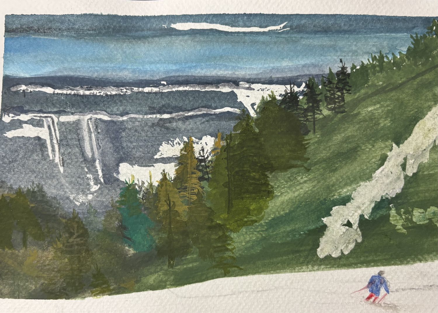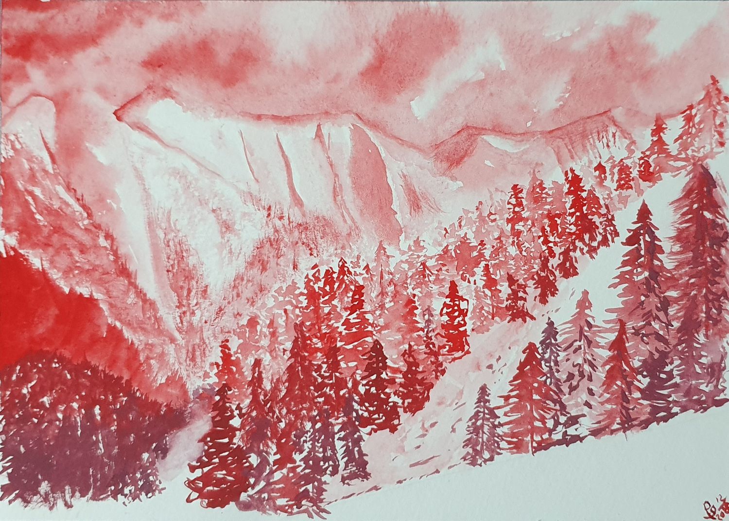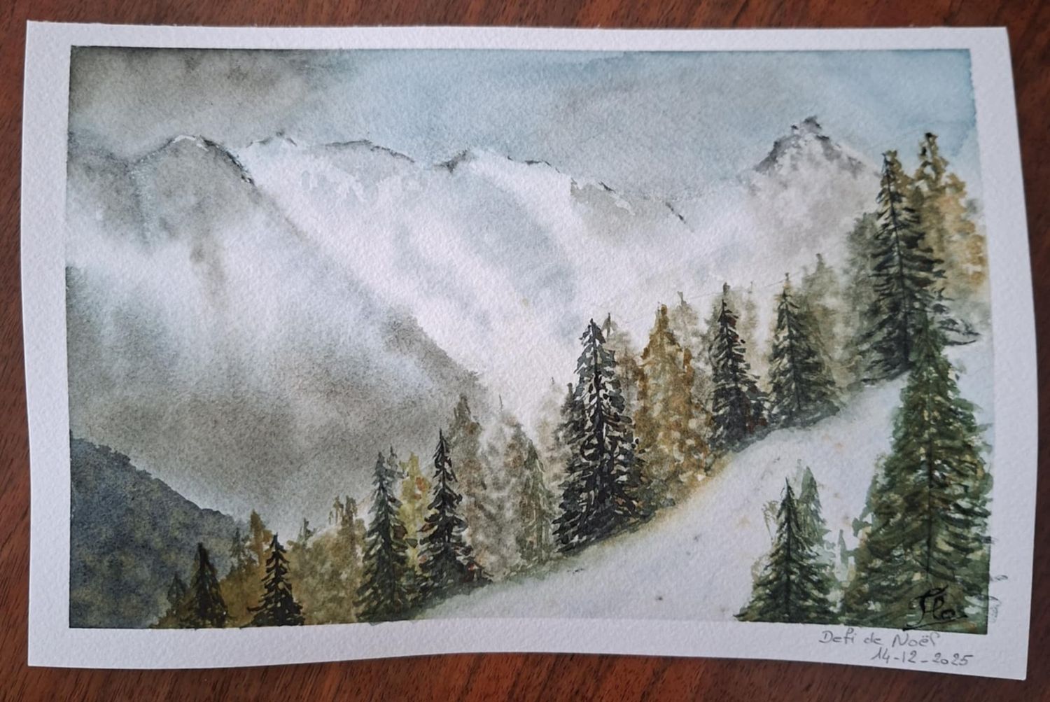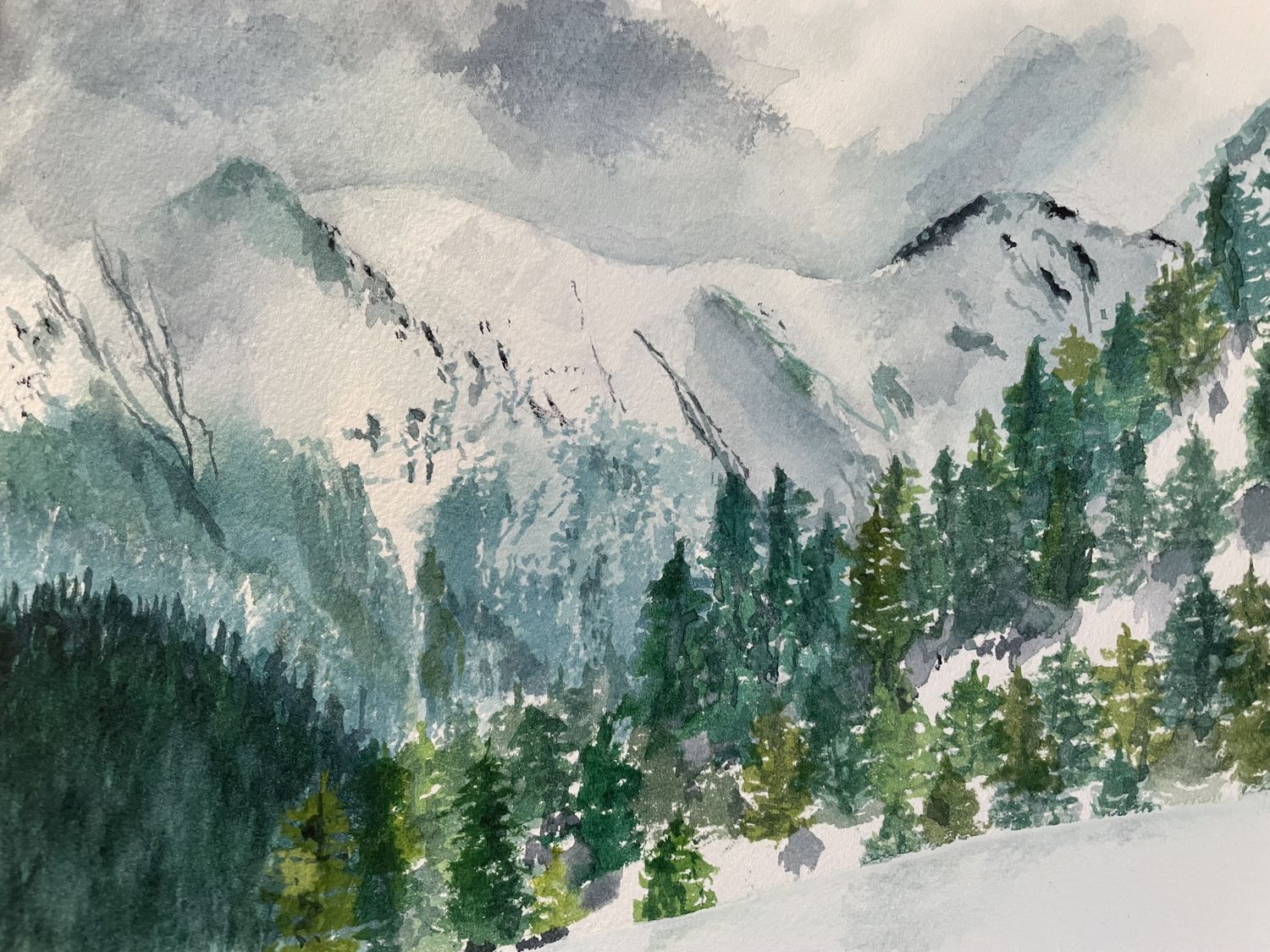 J’ai eu beaucoup de difficultés à faire le ciel, et c’est visible évidemment. J’ai cru me retrouver dans la même galère que le ciel pour faire les montagnes, ouf je m’en suis mieux sortie. Pour les sapins, je n’ai pas bien géré l’humide et j’ai été trop timide sur mes coups de pinceaux, la diffusion n’à pas été suffisante et ça rend l’ensemble peu cohérent. Je ne m’en suis pas rendue compte tout de suite, et ce n’est qu’en prenant une photo que j’ai vu, c’était trop tard. Sur la fin je me suis aperçue que je n’avais pas suffisamment de contrastes et j’ai ajouté une couleur plus forte sur les derniers sapins supposés être au 1er plan