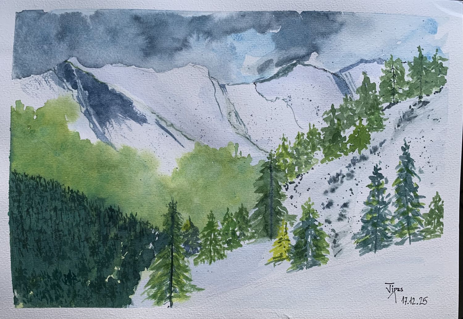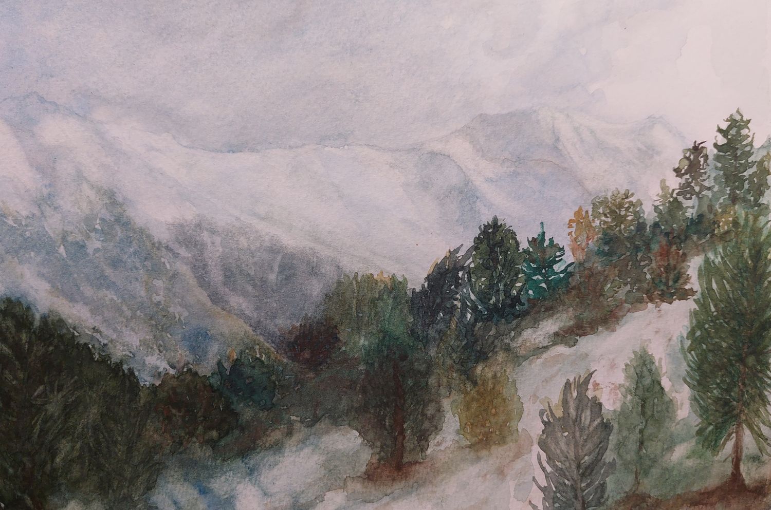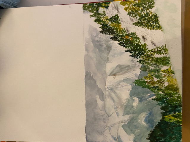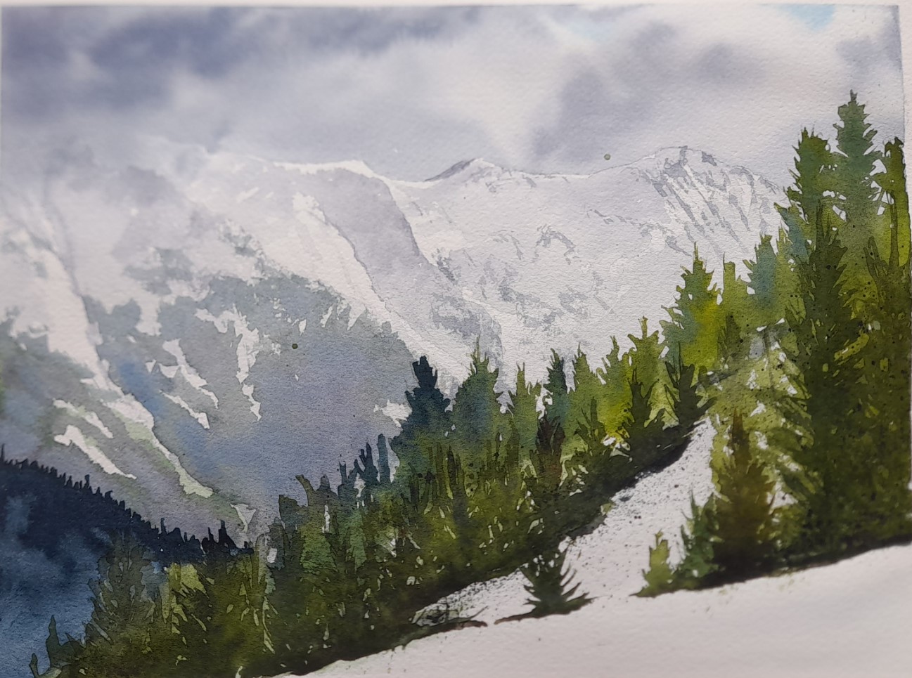 Pas mal de difficultés à peindre les sapins de façon réaliste, j’ai tenté l’arrière plan dans l’humide mais he trouve la masse sombre des sapins mal détaillés