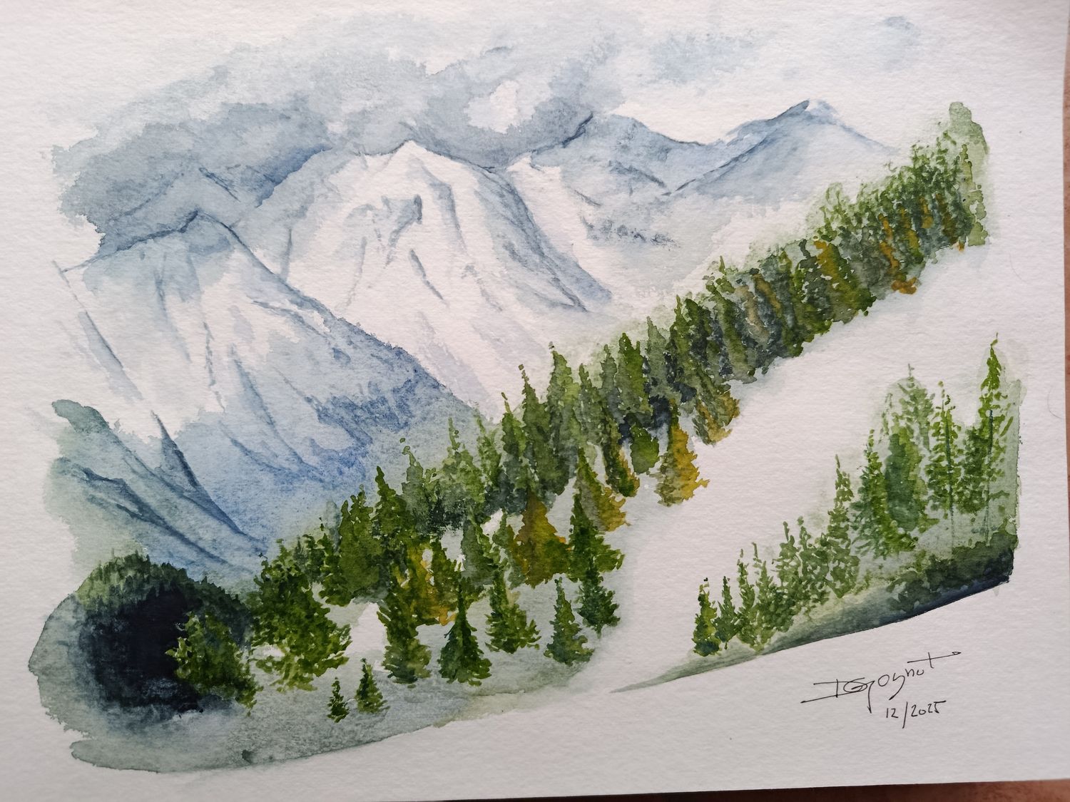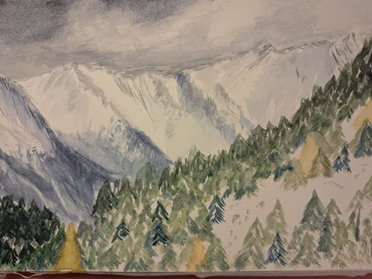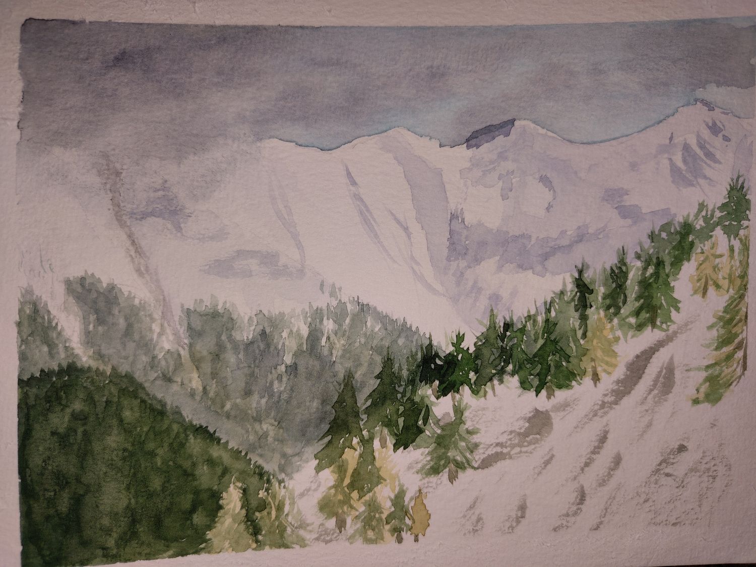 Bonjour à tous! Je suis bluffée par les différences de traitement pour un même sujet! C'est inspirant ! Malheureusement mon niveau très basique ne me permet pas encore de me libérer complètement du modèle pour aller vers une interprétation plus personnelle mais ça va venir, j'y crois! Je rends ma copie et je remercie Thibault pour ce challenge bien sympathique qui donne à travailler. De mon point de vue, j'ai trouvé difficile de bien "contraster" le ciel et la montagne et éviter une bouillie grisâtre. Le travail de la lumière reste un objectif que je dois encore travailler. Merci à tous pour vos partages et bonne soirée de l'Isère.