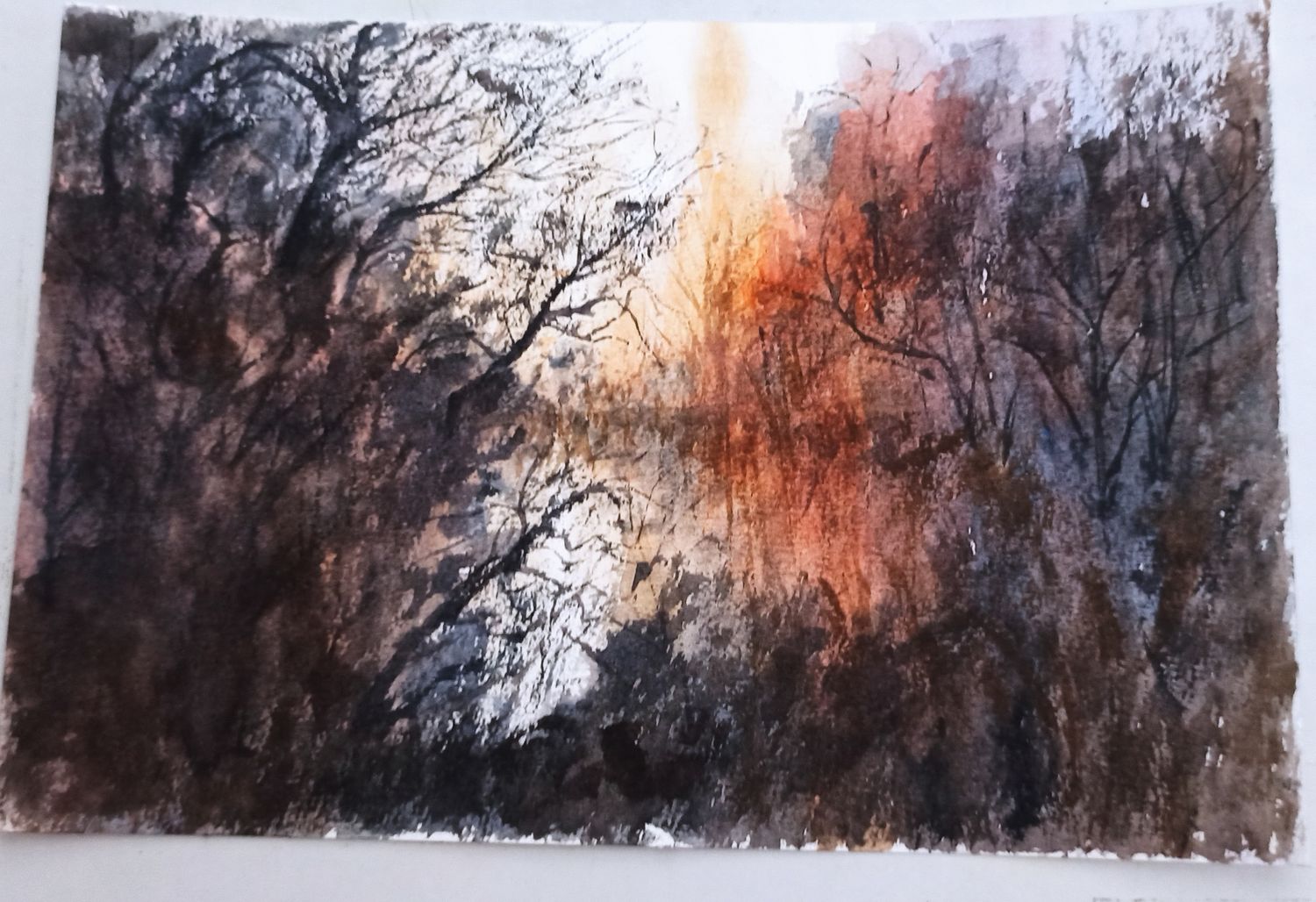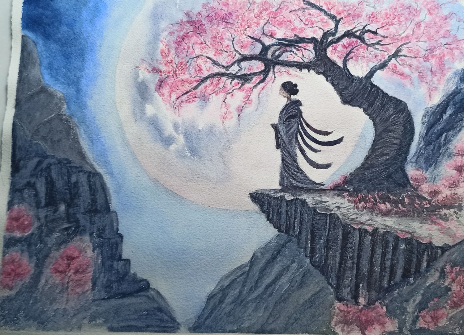 Bonjour à tous. Je voudrais vous partager deux aquarelles que j’ai faites récemment l’une, style orientale "dialogue silencieux avec la Lune", que j’ai offerte à ma belle fille pour son anniversaire. Format A3, papier Baohong, 100% coton, 300mg. L’autre "à la recherche de trouver la lumière avec l'obscurité", même papier, format A4.