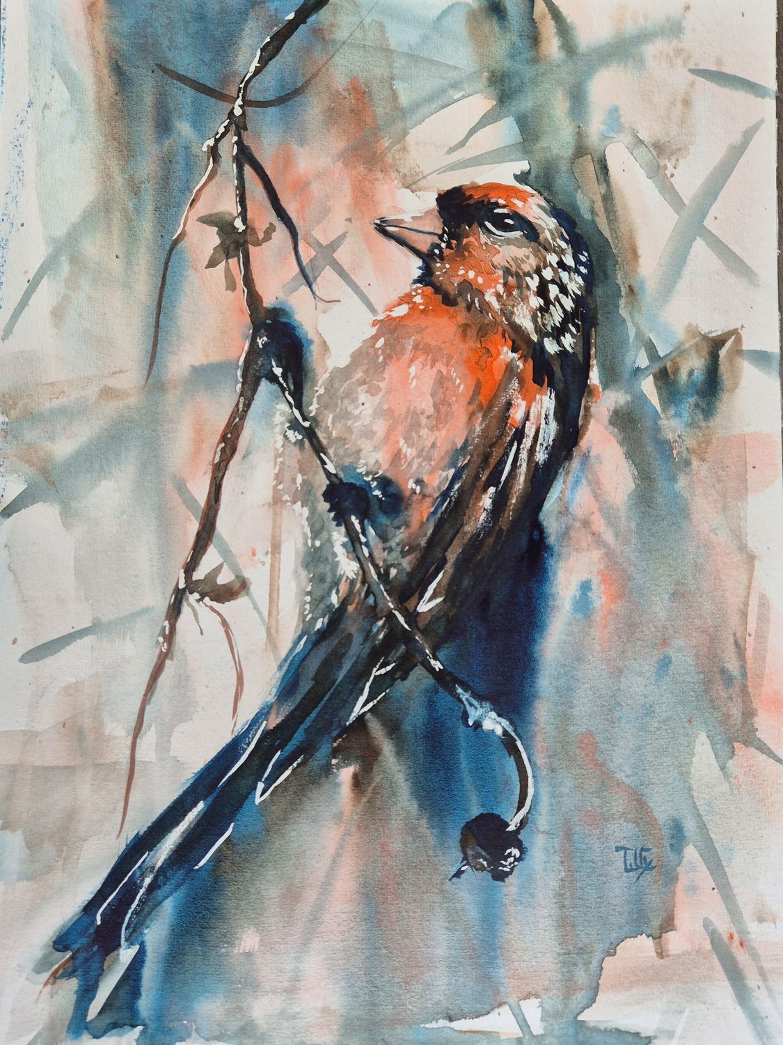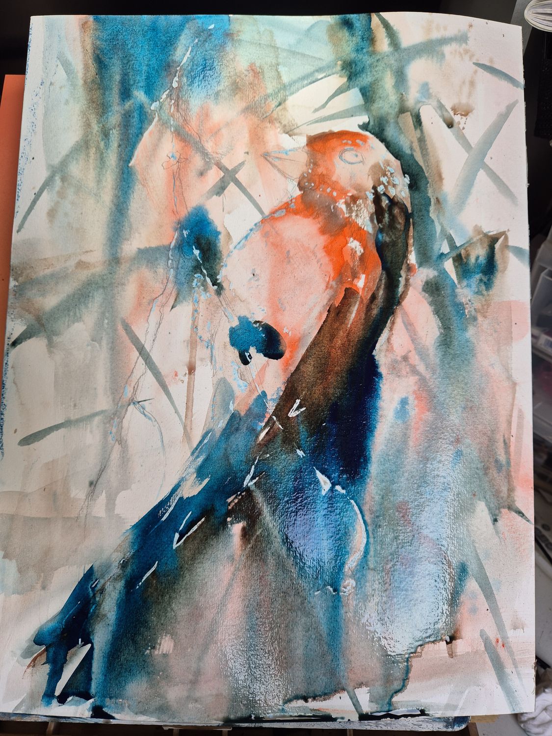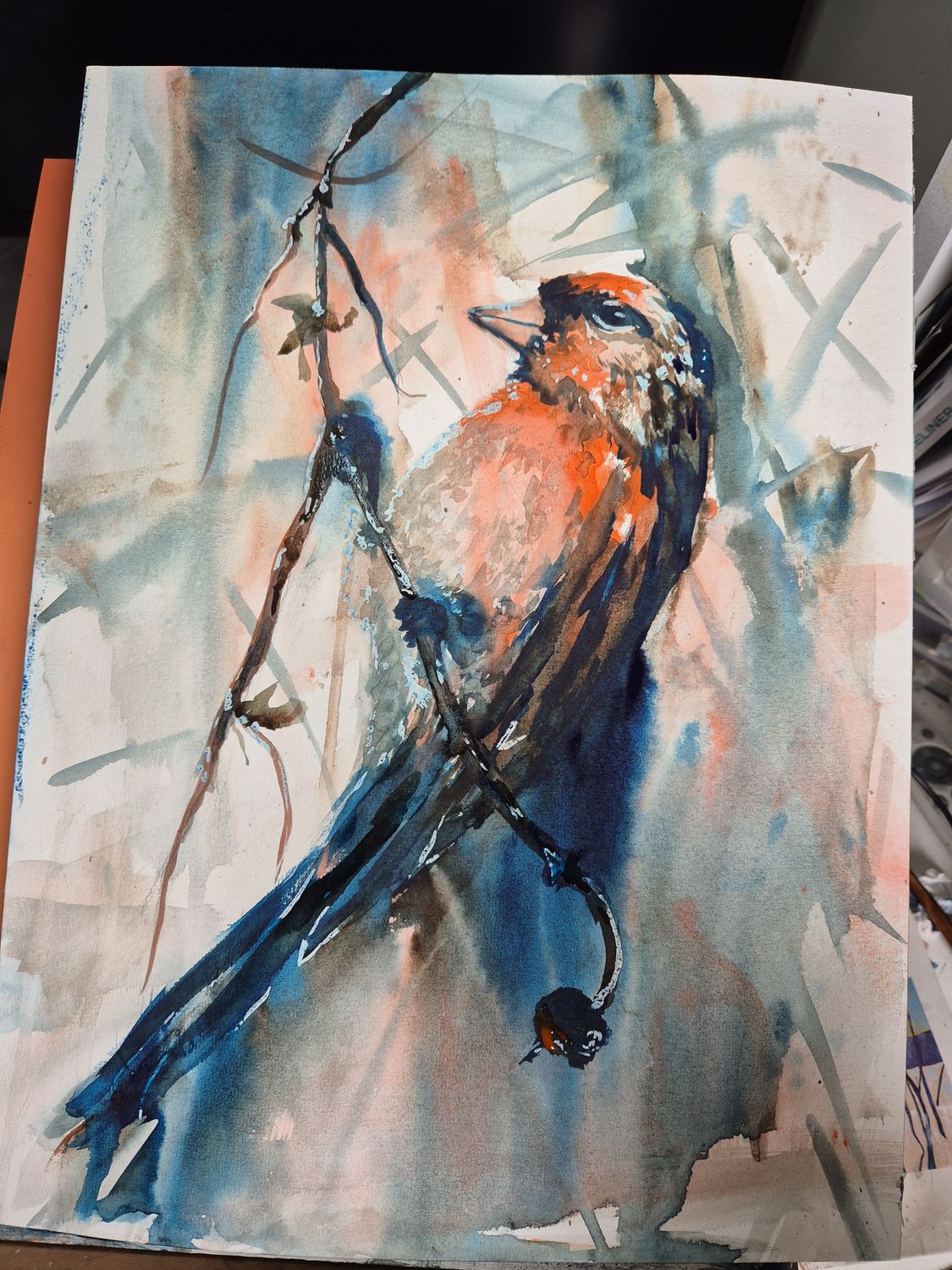 Alors, j'ai fait cet oiseau qui m'a inspiré. Je dois préciser que je fais de l'aquarelle depuis janvier, c'est ma résolution 2026. En revanche, je peins depuis plus de 6 ans et suis accompagnée de professeurs de ma région. J'ai donc la théorie et ma pratique d'autres médiums, mais pas la pratique de l'aquarelle.
