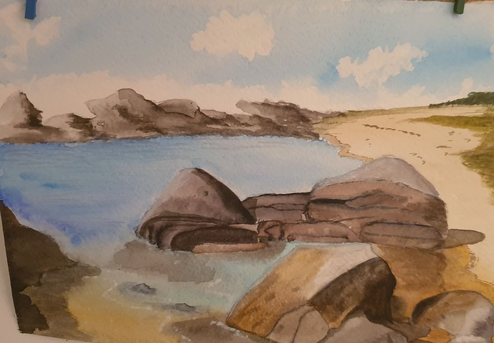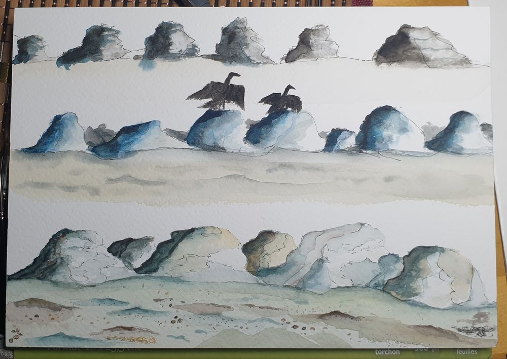 Pour mon humble niveau, la technique a fonctionné. Il me semble que l'on reconnait les rochers. J'aurais sans doute pu accentuer les contrastes. Comme d'hab, les couleurs s'éclaircissent en séchant.