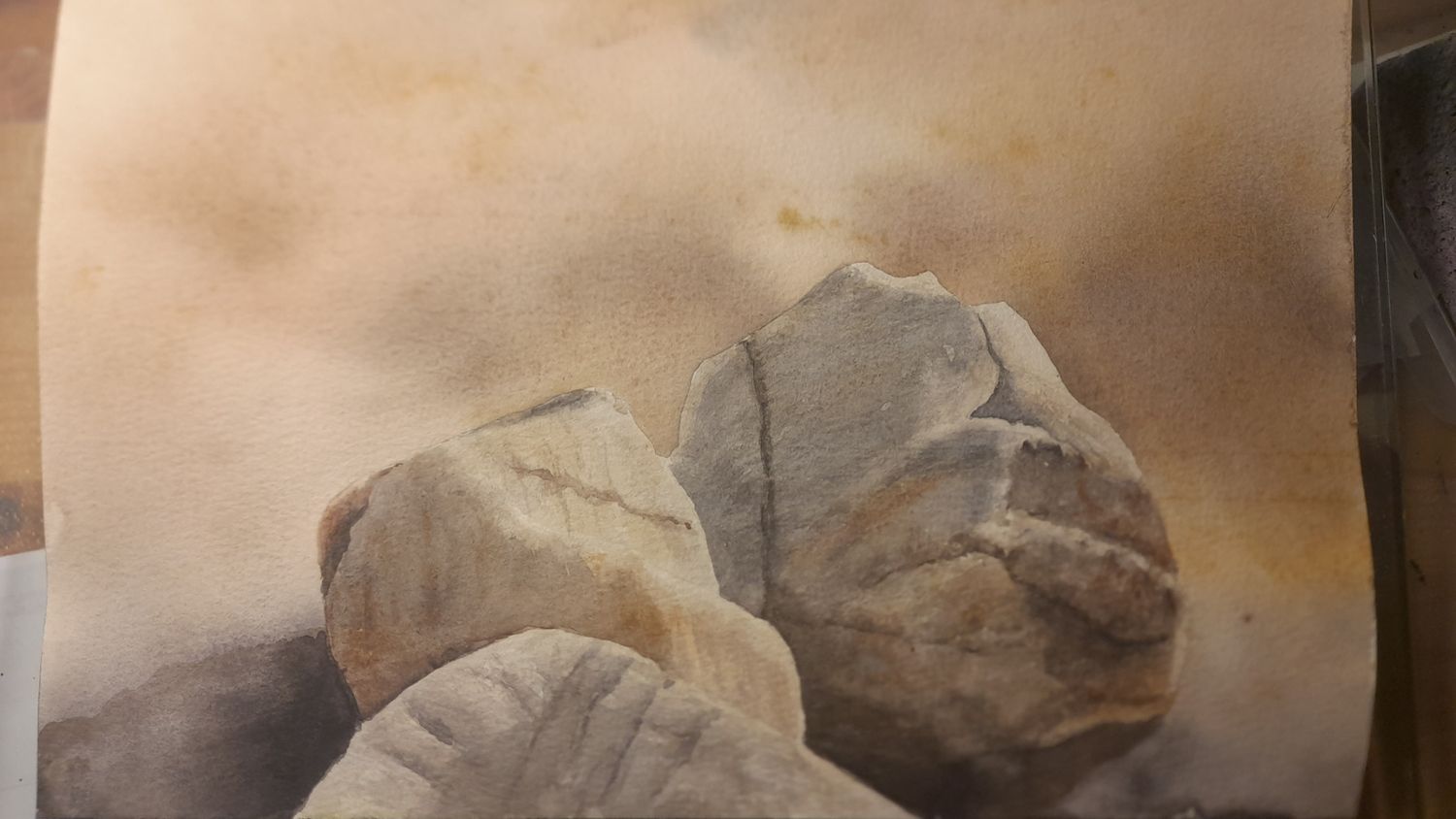 - j'ai mouillé les rochers pour travailler un premier lavis en mouillé sur mouillé. en mixant différentes couleurs. Ca m'a donné la couleur des zones claires