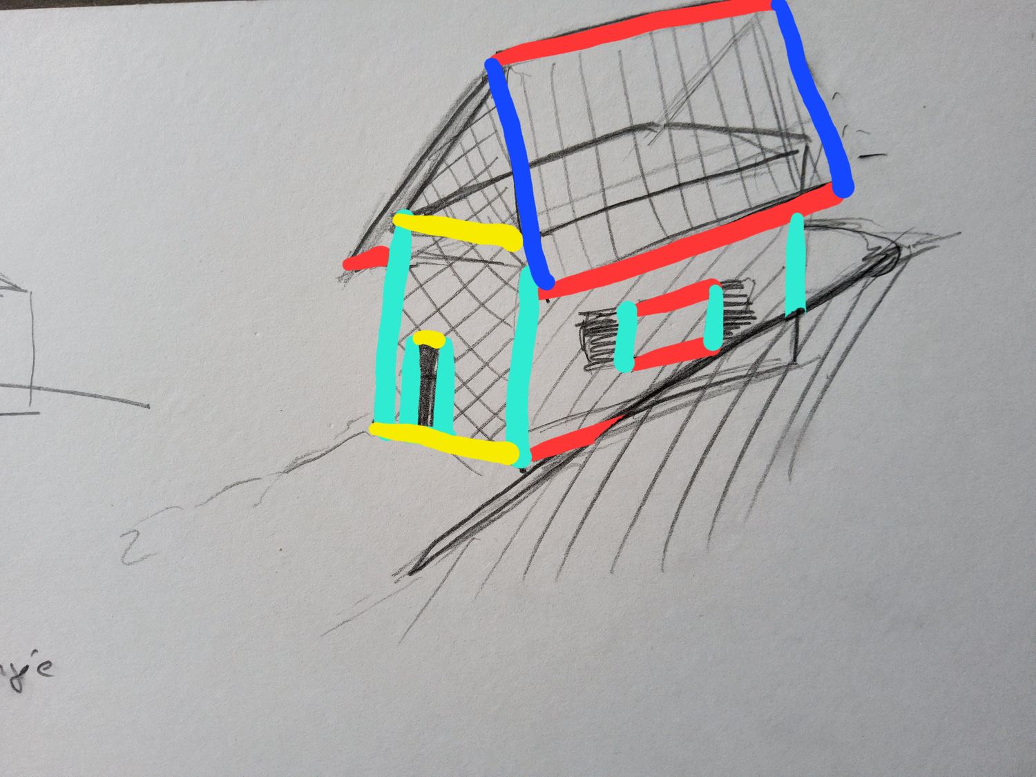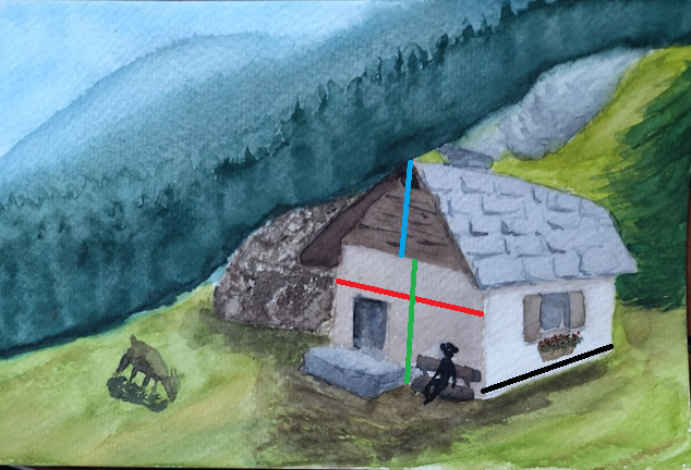 4/ A l'inverse, pour nous faciliter la vie on peut assumer que les murs sont bien verticaux, ainsi que les portes et fenêtres, que le faitage du toit et les gouttières sont horizontaux.