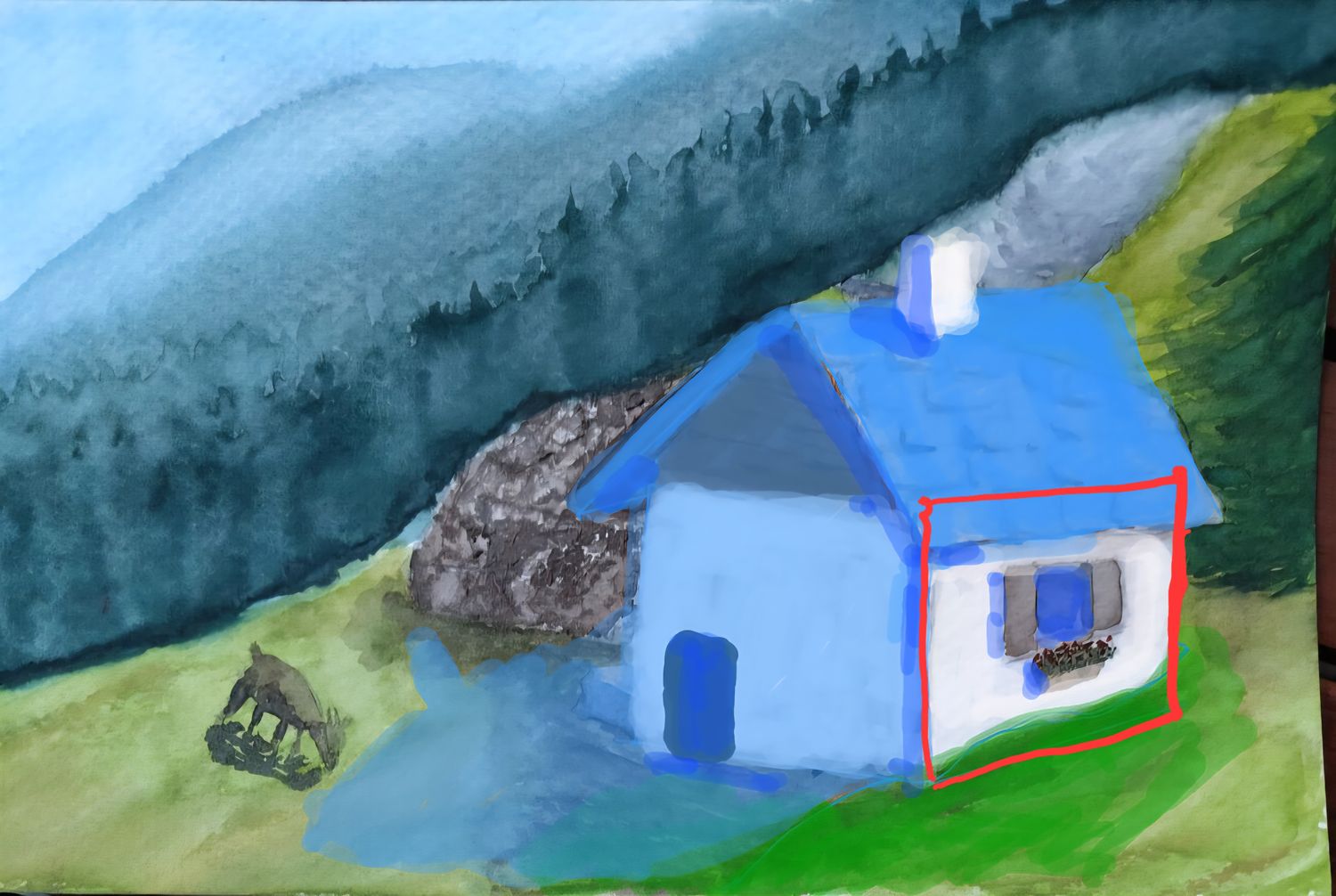 Et on est d'accord que j'ai retouché la perspective, mais clairement pas respecté la forme du chalet, car j'ai utilisé le dessin présent.