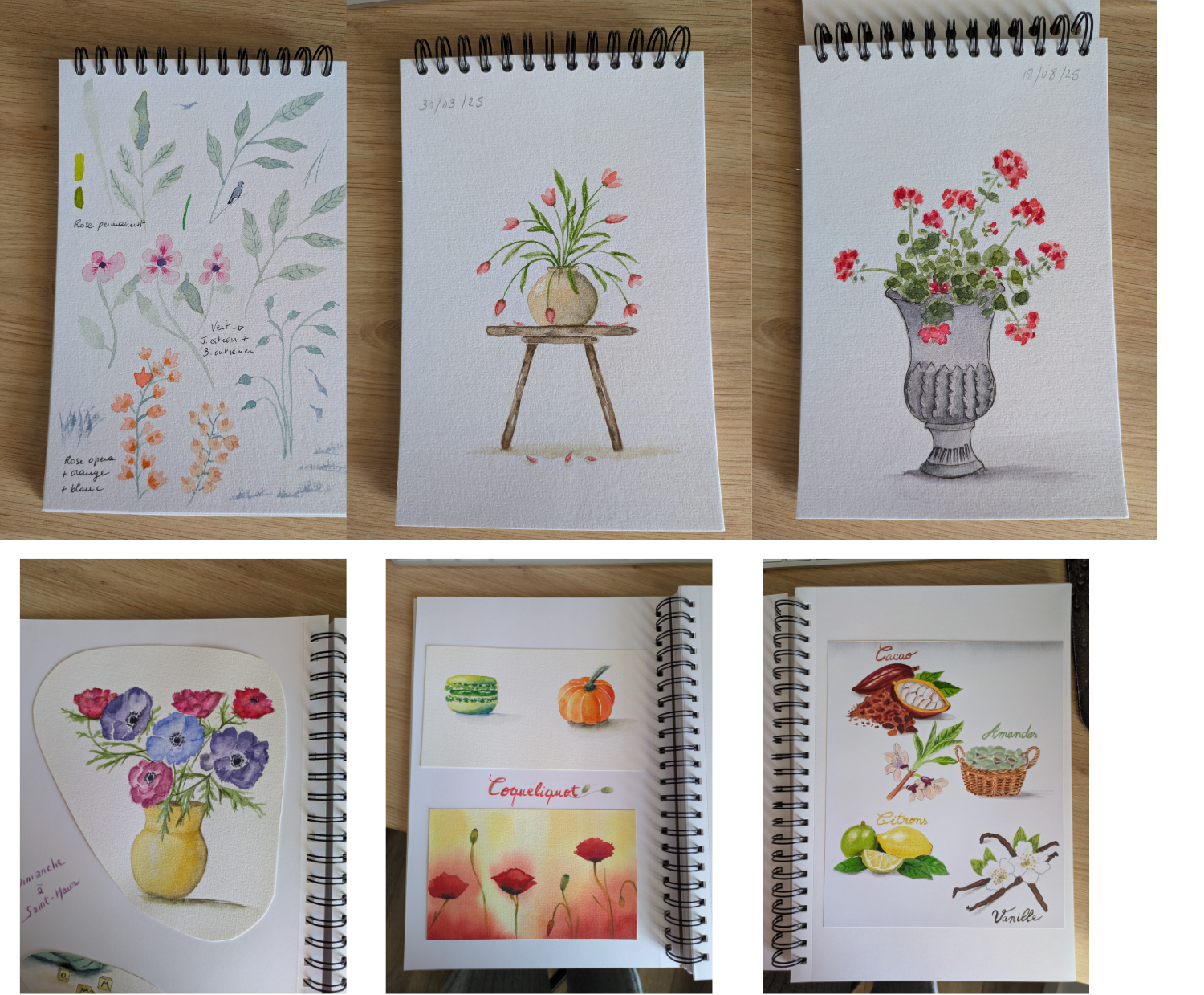 Bonjour, pour moi même plus qu’un carnet, c’est avoir un kit de pratique qui m’aide. J’en ai eu avec différent contenu, de différente taille, mais l’idée est d‘avoir toujours sous la main un truc pour peindre.