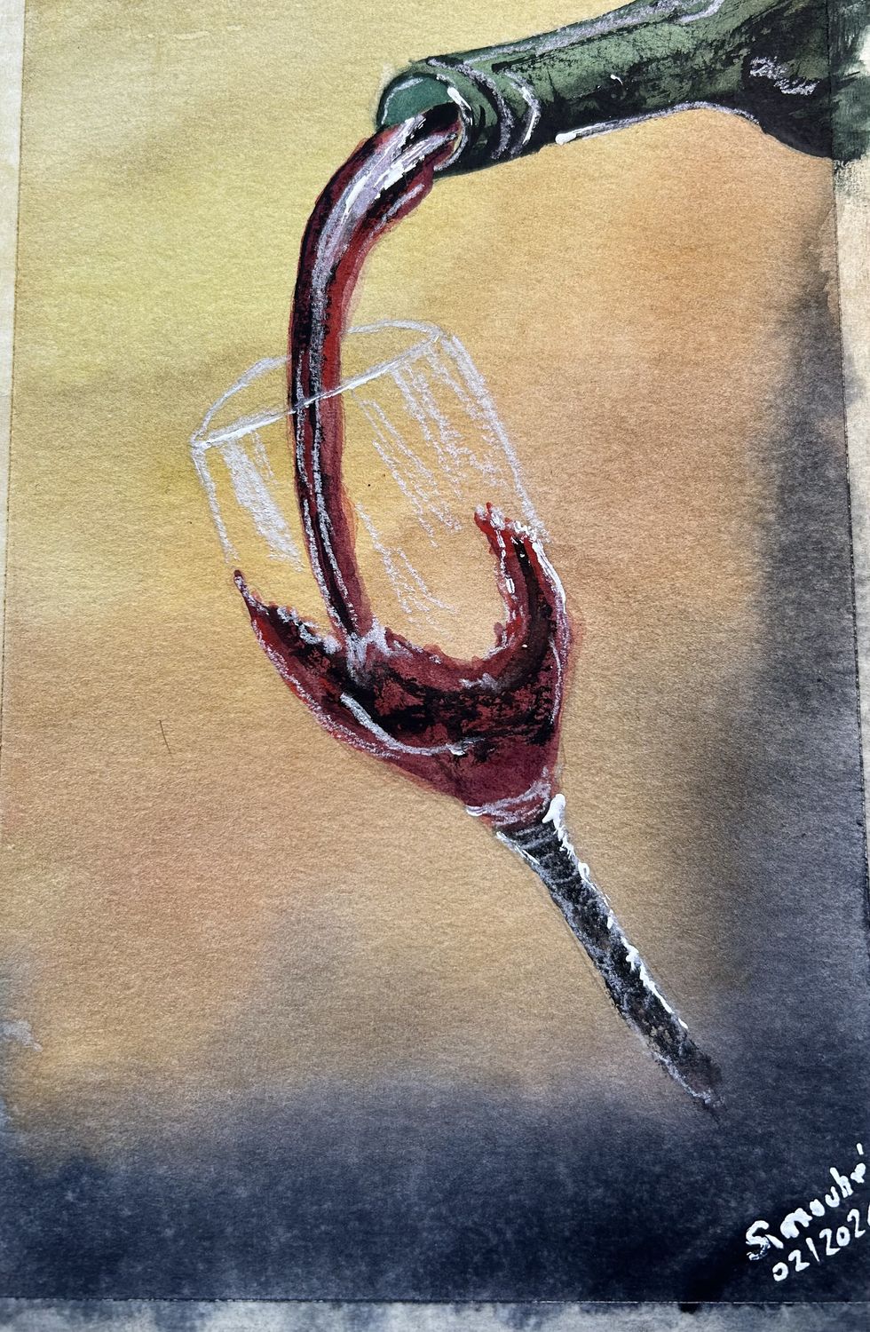 Je vais refaire la bouteille le fond n'est pas assez sombre à la hauteur du verre de sorte que les reflets ne ressortent pas assez (pour le blanc ai utilisé un crayon aquarelle)