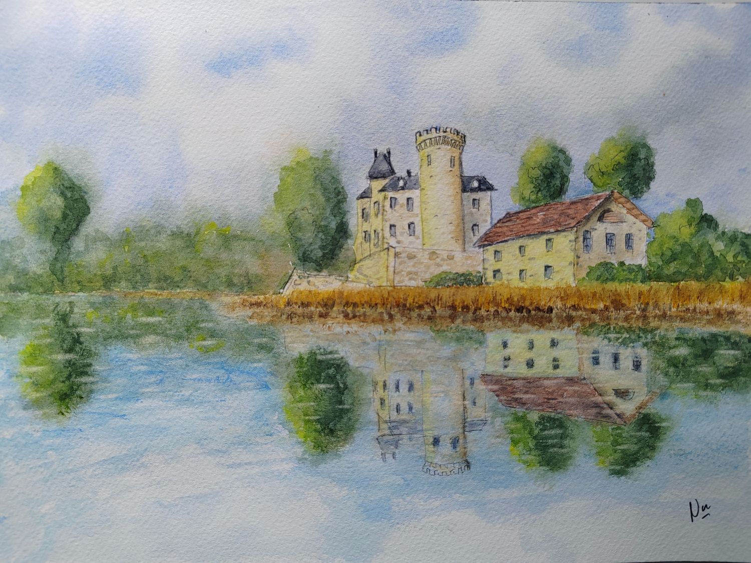 Bonsoir Fneck, à mon avis ton aquarelle manque de liaison entre les couleurs. Le château est dans les tons pâles de ocres, gris bleu etc et d’un coup on a 4 arbres bien verts qui se dressent et qui se reflètent dans l’eau. L’œil ne voit que eux. Sinon  le ciel, le château est le reflet sont réussis.  A bientôt