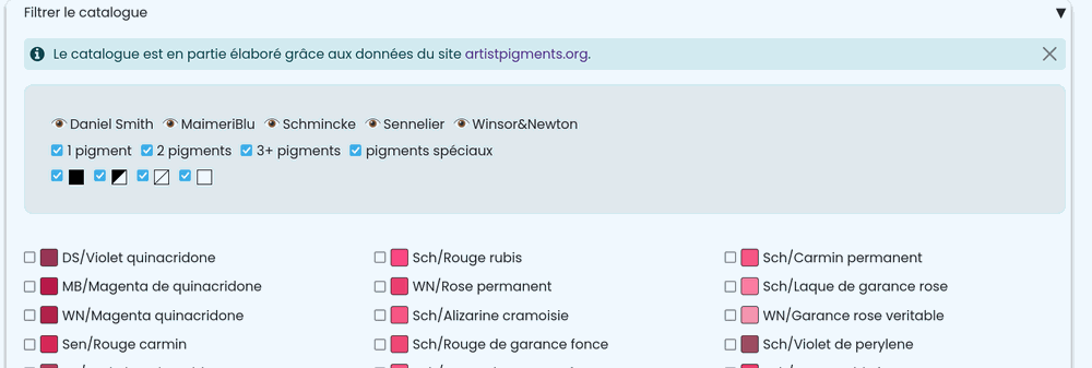• La section "catalogue" a désormais une réelle utilité, celle de pouvoir filtrer selon la marque, le nombre de pigments ou la transparence/opacité.