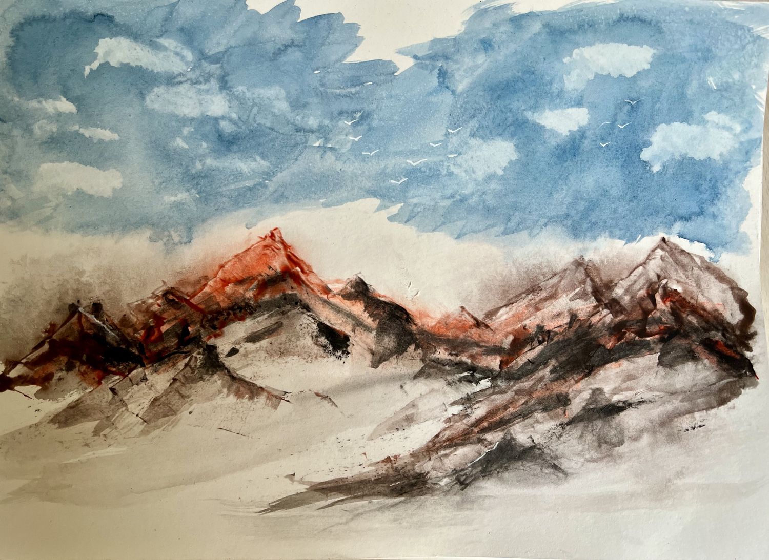 Couleurs: Vermillon, Noir pour les montagnes, Gris de Payne et Bleu de Cobalt pour le ciel. Posca pour les oiseaux