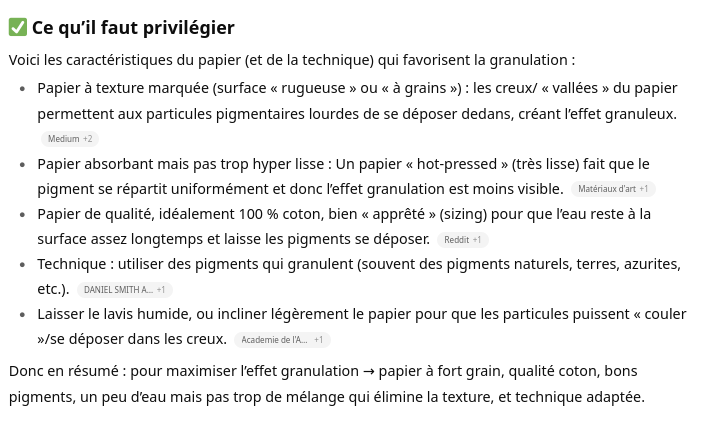 Un sub reddit avec 3 interventions, je vous laisse juger de la fiabilité. Mais le plus amusant, c'est que ce site dit exactement le contraire de ce qu'a synthétisé le modèle de langage. Dans cette discussion, l'utilisateur demande pourquoi il a des effets très texturés sur son aquarelle, et les réponses lui disent que c'est parce qu'il n'utilise pas du 100% coton. A comprendre donc que le 100% coton éviterait les effets de texture.