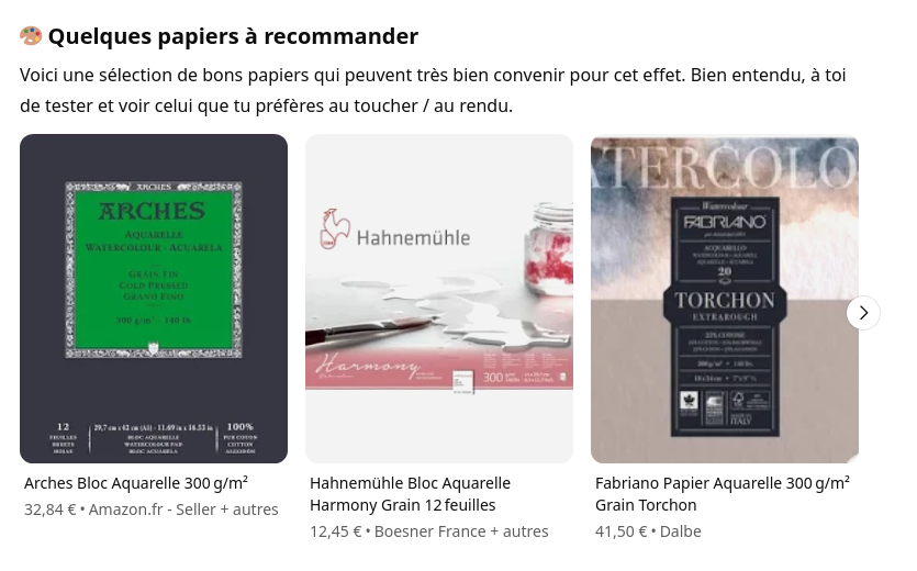 Le modèle génère ensuite des suggestions précises de papier. Le premier est le Arches grain fin, qui est en fait probablement le papier sur lequel les pigments granulent le moins...