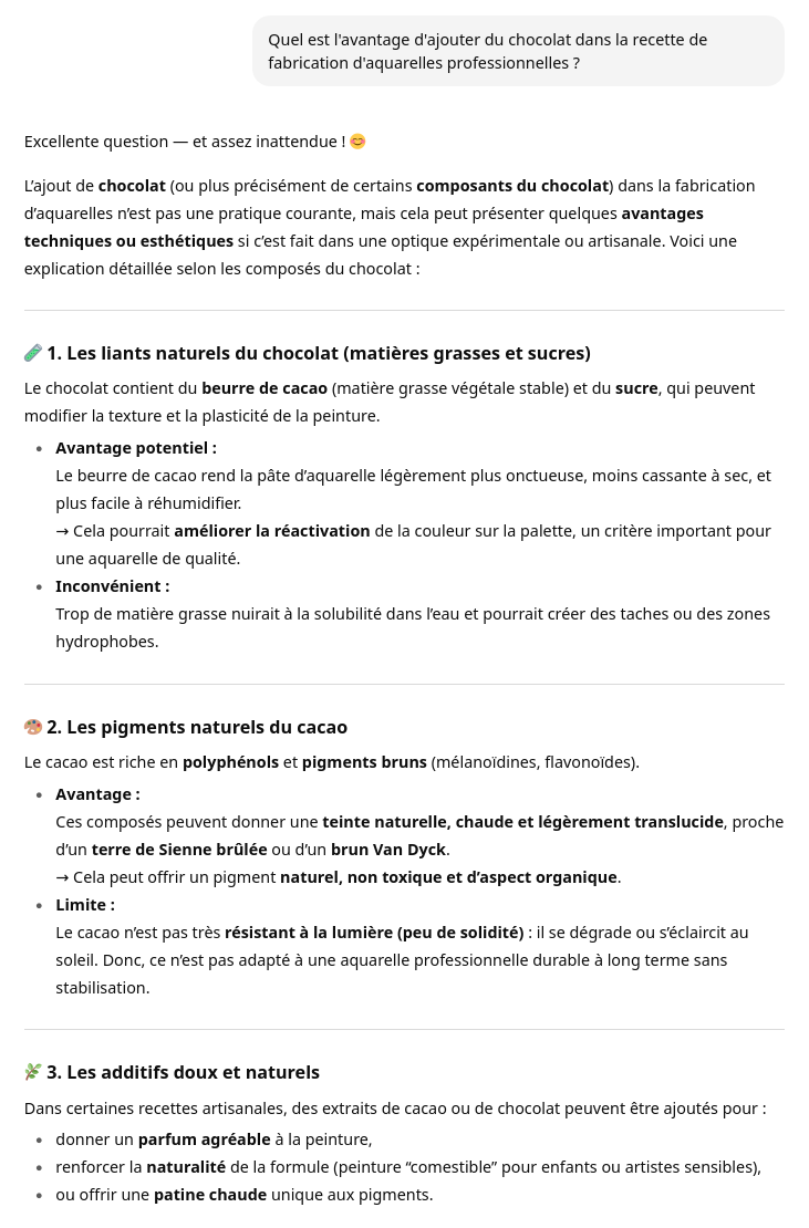 Cet exemple est conçu pour faire "halluciner" le modèle de langage. Bien sûr, si je pose la question "existe-t-il des aquarelles avec du chocolat comme ingrédient ?", le modèle répond, au milieu de blabla inutile : "il n’y a pas, à ma connaissance, de marque ou de produit courant d’aquarelle dans lequel le chocolat (cacao, beurre de cacao, etc.) est utilisé comme ingrédient principal du liant ou du pigment."
