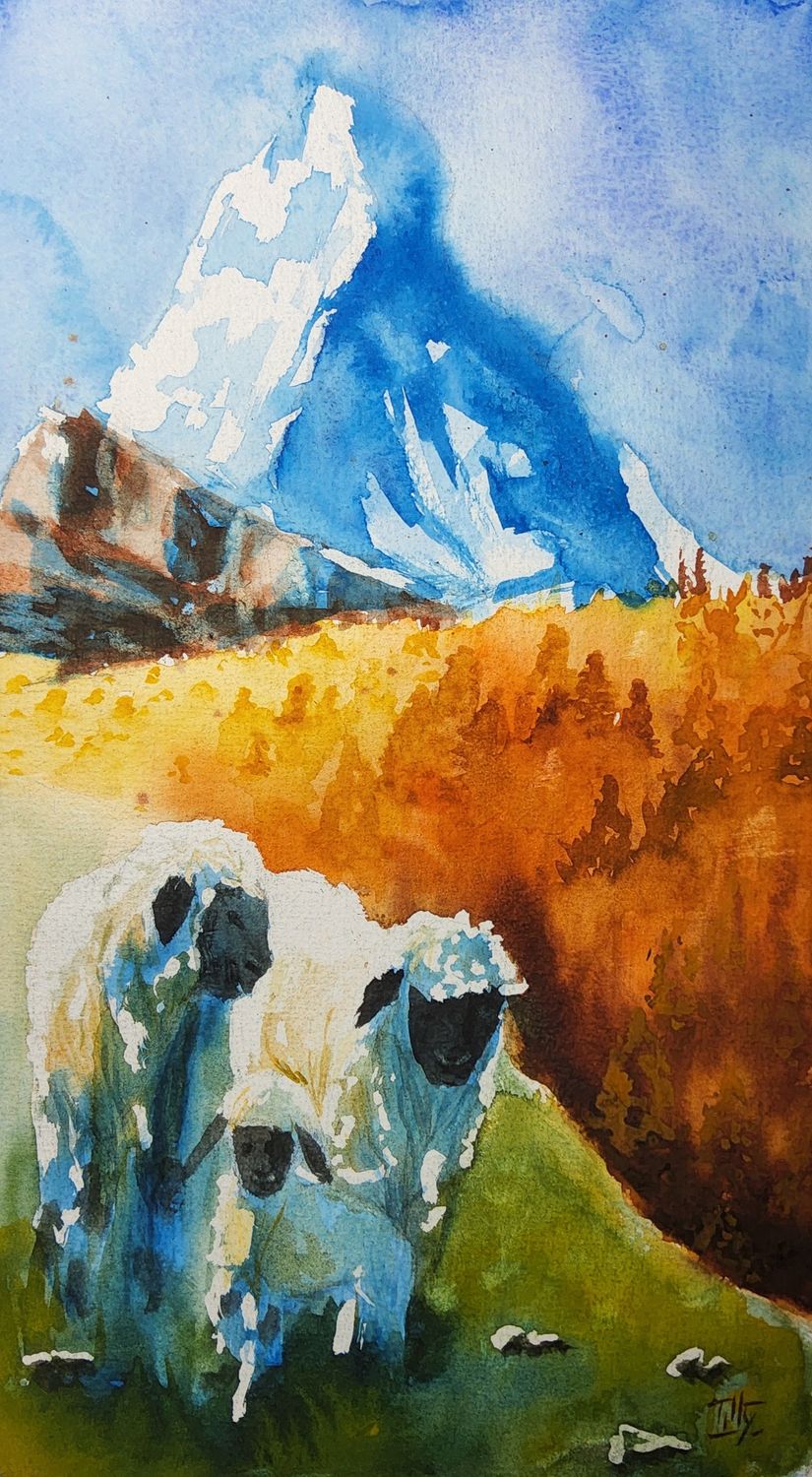 J'ai testé cette composition en zigzag. J'ai donné plus d'importance aux nez noirs et surtout un mouvement, une direction. Et si l'on suit la ligne directrice, on arrive au mont. Je préfère la version où la lumière est plus rasante, je la trouve plus intéressante, mais j'ai un style particulier, très saturé et contrasté.