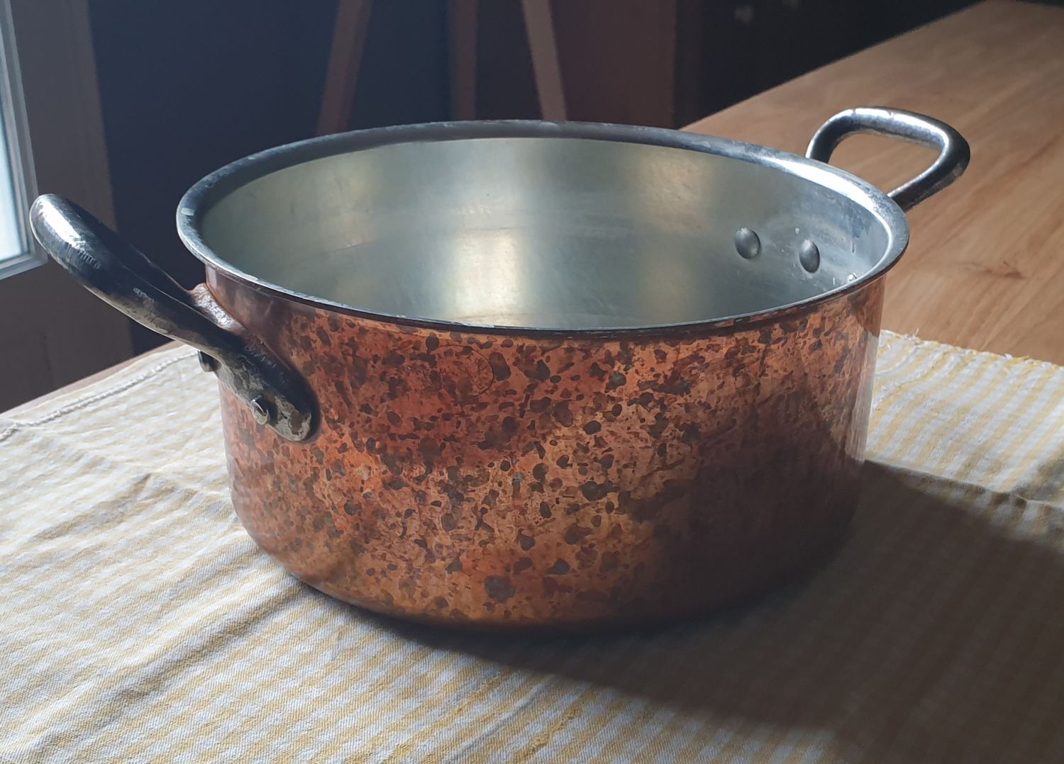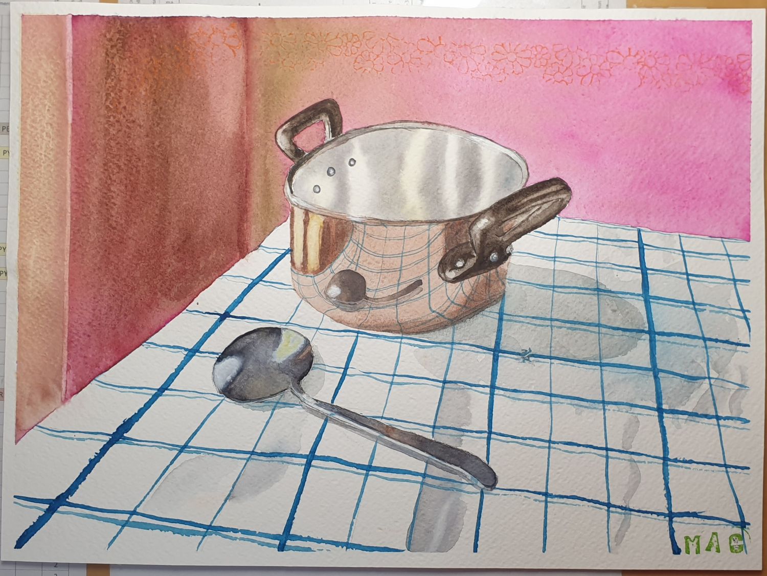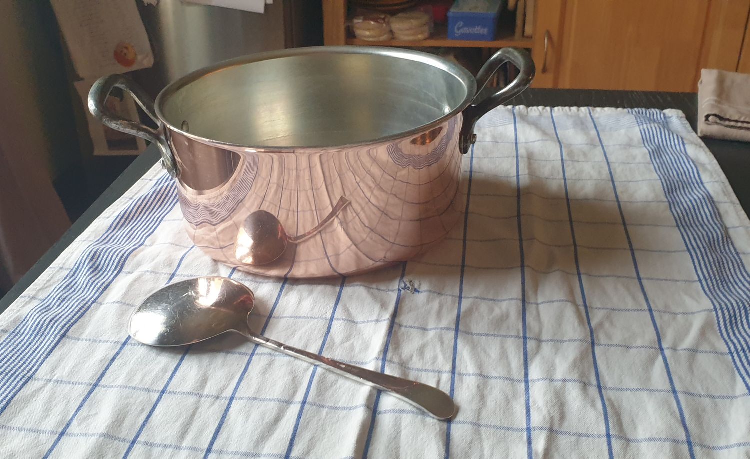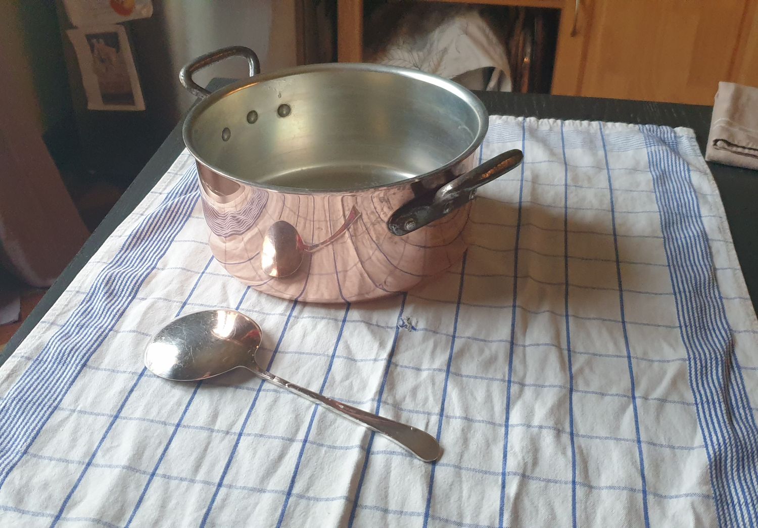 Attachee a la réalité, je suis allée récurer ma casserole en cuivre et j'ai fait des photos sur torchon à rayures pour voir la réalité des reflets... je travaille sur le sujet, trouver la couleur cuivre n'est pas non plus évident, je m'aide de l'analyse d'images de Thibault dans le laboratoire.